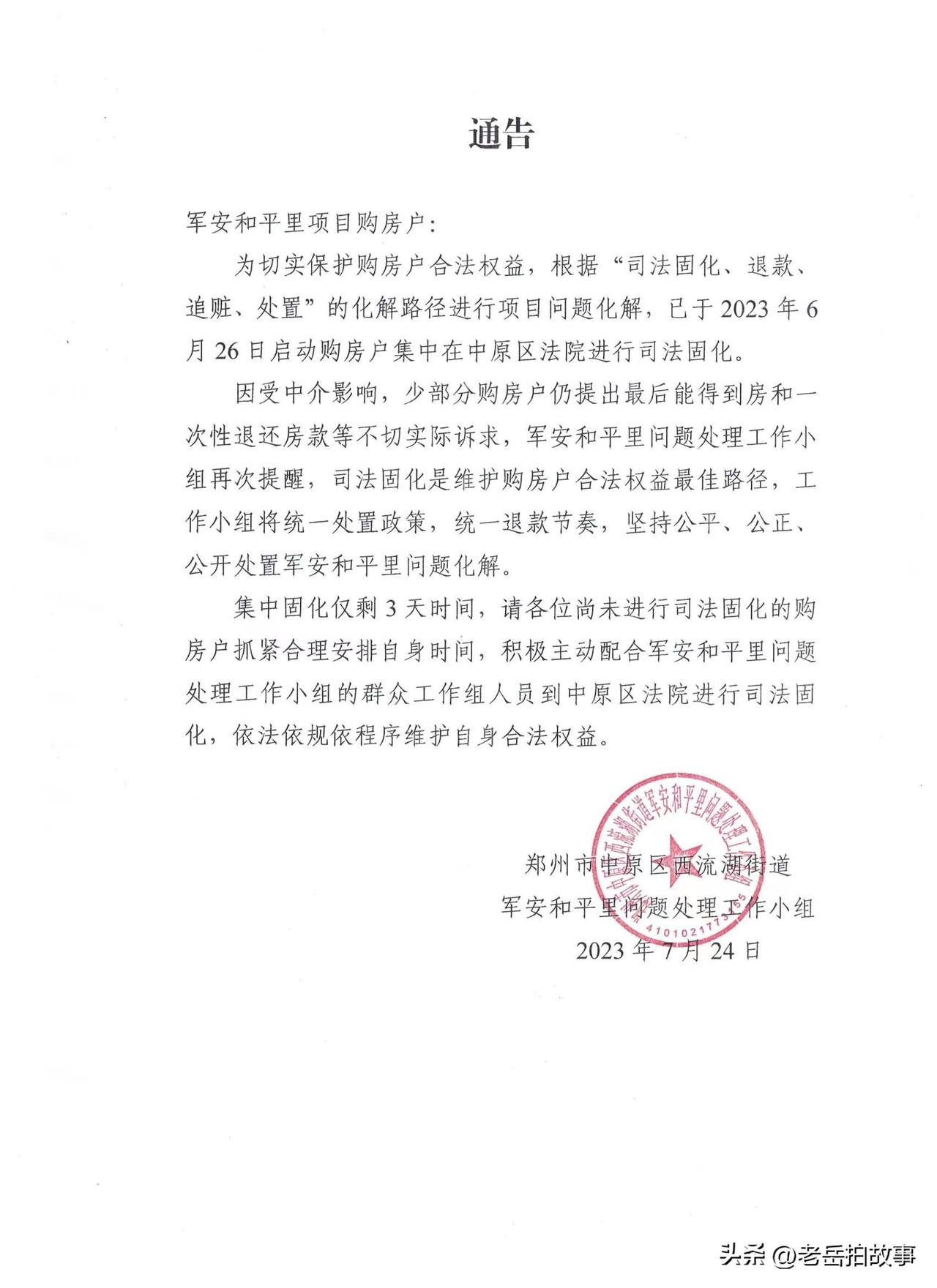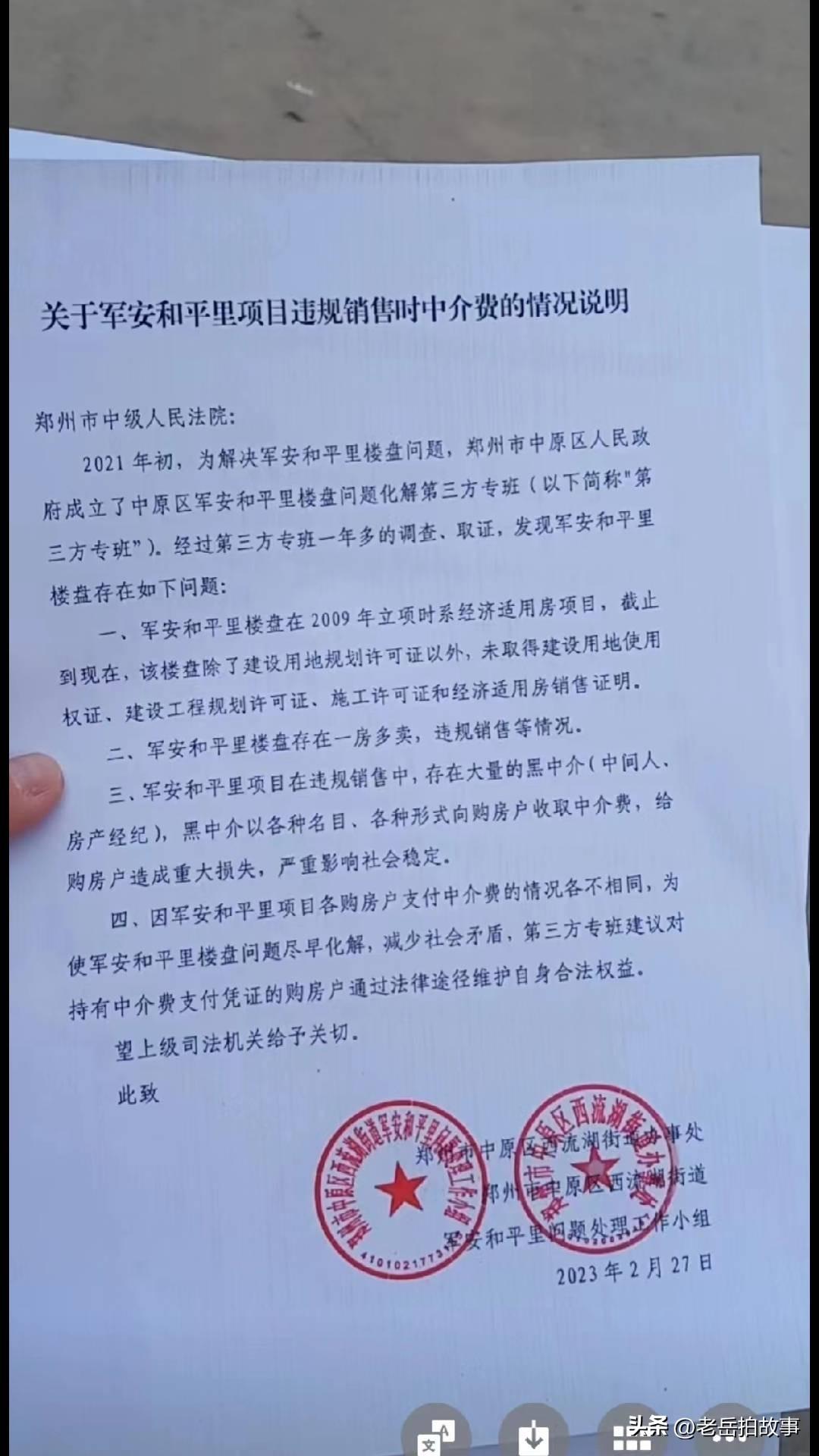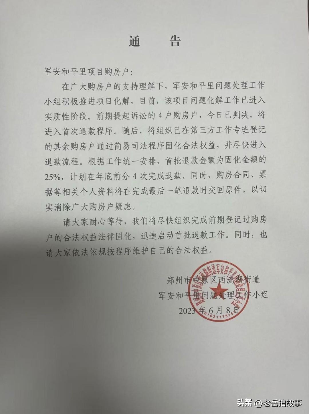 真是杀猪杀屁股,各人有各人的杀法儿:一度闹得沸沸扬扬,世人皆知的郑州市中原区西流湖街道办的军安房地产违规操作,以中介人收取好处费的方式,面向社会不固定人群,重卖经济适用房一事,经过多年的风风雨雨,和近千户买房人锲而不舍,前仆后继的信访维权下,最近又有了新动向(新动向内容如下截图)。但这是真的能解决问题?还是权宜之计现在真的不好说。为啥这样说,原因有二,第一,如果让买房人入住,那卖重的部分如何解决,一个女人嫁俩婆家,最后让谁迎娶?谁来做主?最后,买重房子的人会不会因争夺房子而发生不可预测的问题?第二:允许自救入住是不是意味着以前的通过法律手段进行固化流产了?固化过的人手里拿到的法院判决文书还算不算数?是不是意味着此次倒卖经适房行为已被官方所认可?虽然说房子主体已经完工,但后续的日常用水、电及道路铺设、环境绿化等辅助工作及资金筹措如何进行…… 不管咋说,这对于已经四处维权,到处苦诉的买房人来说,也算是一个喜讯,毕竟又有了新进展,但接下来结果如何?个人觉得真得不好预测!毕竟当初买房的时候,各家都拿出了几十万扔在了里边,有的是贷款,有的是转借……,可谓是分分辛苦,毛毛血汗挣来的血汗钱。有些买房人为此已经付出了太多的代价和心酸,有的为此已经家庭四散,衷心的祝愿,接下来的进展能够是实实在在的东西,而不是权宜之计!祝愿郑州市中原区军安买房人接下来走好运,早日实现愿望与梦想。