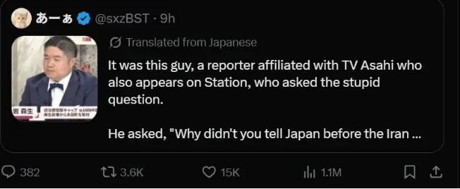 解决不了问题,就解决提出问题的人,高市早苗的支持者猛烈批评向特朗普提问让高市难堪的记者千千岩森生,要求朝日电视台封杀该记者。 在事情发生之后,很多高市支持者在千千岩的社交媒体账号下留言疯狂攻击他,认为是他提了不该提的问题,才让特朗普提及珍珠港事件,令高市乃至整个国家受辱。一些支持者甚至扒出他曾经任职朝日电视台驻我国记者主管的经历,刻意炒作阴谋论,影射他可能是叛徒故意提问让高市难堪。 这帮人也真是可笑,提及珍珠港事件让高市难堪的是特朗普,他们不敢批评特朗普,而是把不满情绪宣泄到自家记者身上,做美国小弟做到这份上也算是忠诚度拉满,也不难理解毕竟连在现场的高市都不敢回嘴反驳,更何况这群高市的支持者。[捂脸]