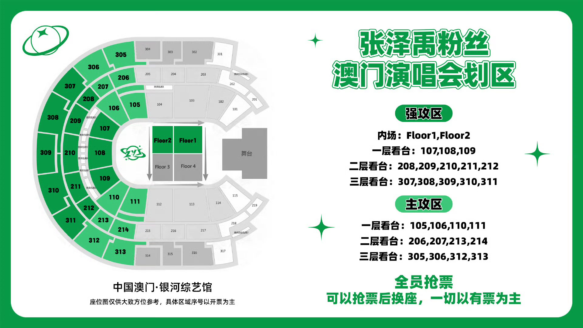 TOP澳门演唱会划区,一右一左一中,不过苏新皓家范围好大一片。苏新皓 朱志鑫 张