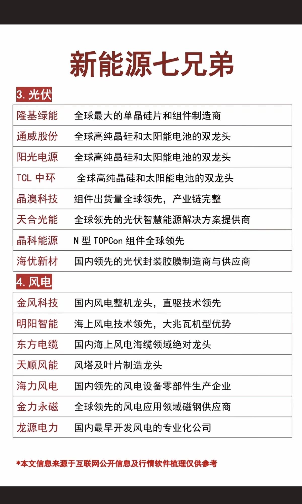 未来能源——新能源七兄弟! 1.锂电池 2.储能 3.光伏 4.风电 5.新能源汽车 6.绿色能源 7.氢能源 相关领域绝对的龙头股: