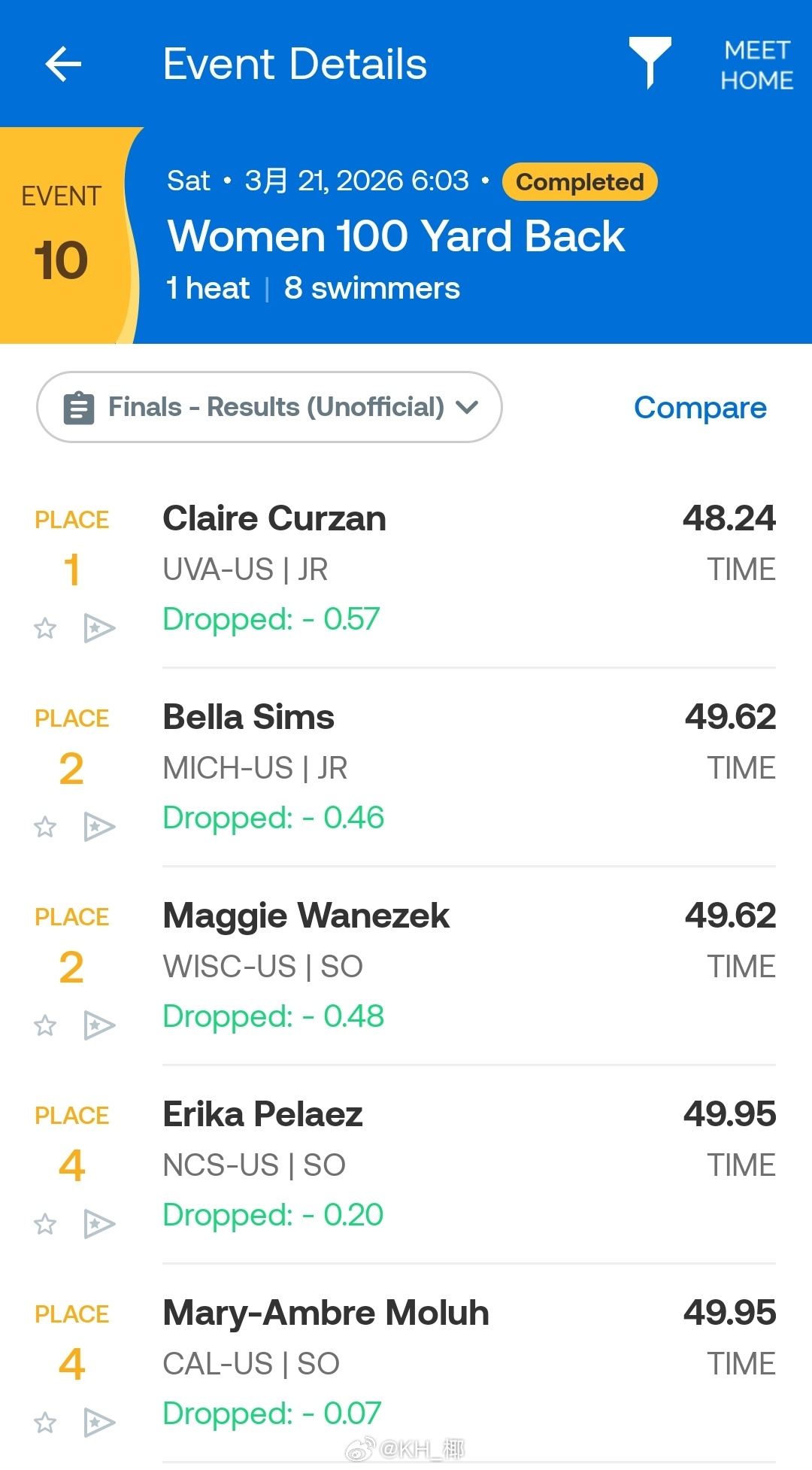 NCAA DI Women's Championships 女100码仰泳决赛,Claire Curzan 48.24 PB历史第二快成绩!仅次于小沃的纪录!