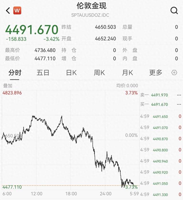 Wind数据显示,3月20日,现货黄金(伦敦金现)反弹昙花一现,日内倒V走势,最终日内跌3.42%,报4491.67美元/盎司,本周暴跌10.24%,创下自1983年3月4日以来的最大单周跌幅。现货白银(伦敦银现)跌6.8%,报67.897美元/盎司,本周累计下跌12.687%。