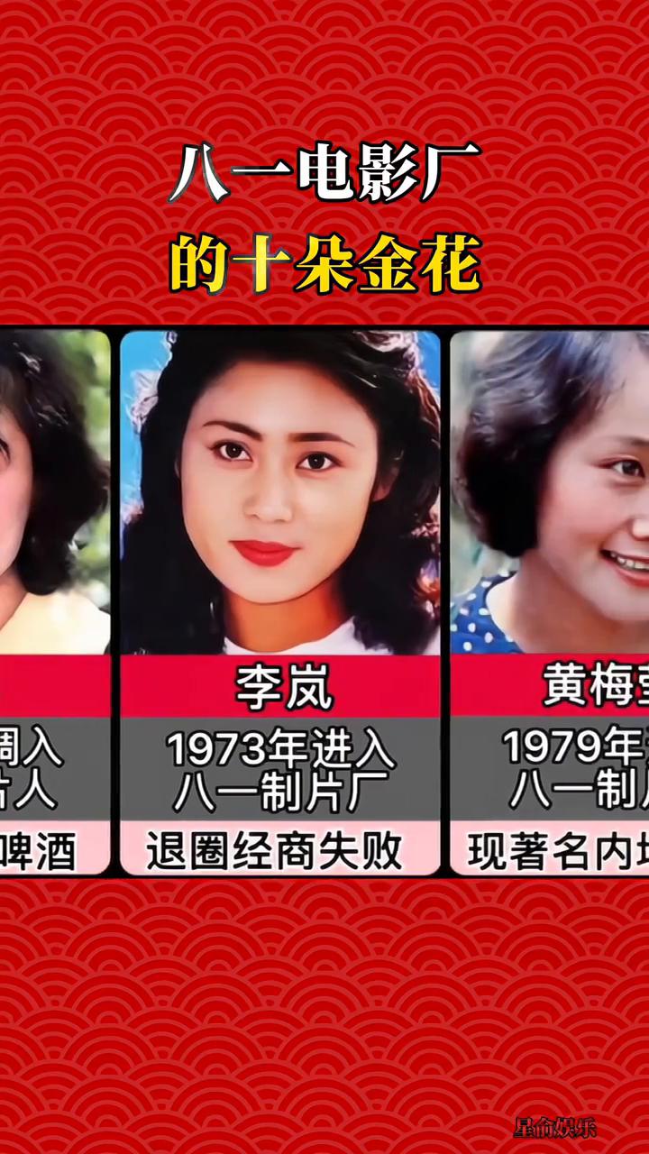 八一电影厂的十朵金花。 ·洪学敏,1974年进入八一制片厂,退圈经商失败。 ·赵娜,1976年调入八一制片厂,退圈经商失败。 ·李岚,1973年进入八一制片厂,退圈经商失败。 ·黄梅莹,1980年进入八一制片厂,退圈经商失败。 ·宋春丽,1980年进入八一制片厂,退圈经商失败。 ·岳红,1984年进入八一制片厂,退圈经商失败。 ·斯琴高娃,1980年进入八一制片厂,退圈经商失败。 ·施建岚,1983年进入八一制片厂,退圈经商失败。 ·庞敏,1992年进入八一制片厂,退圈经商失败。
