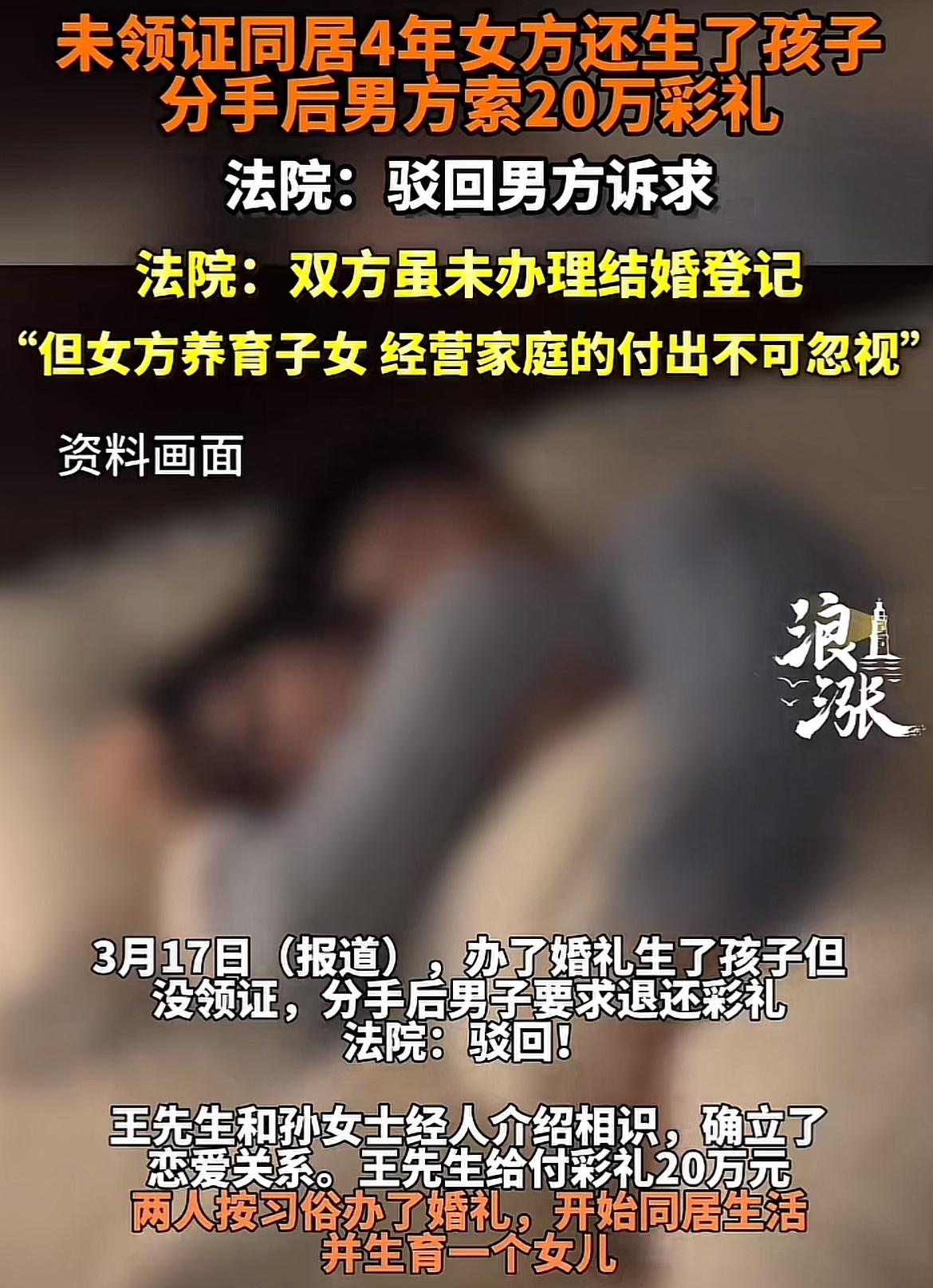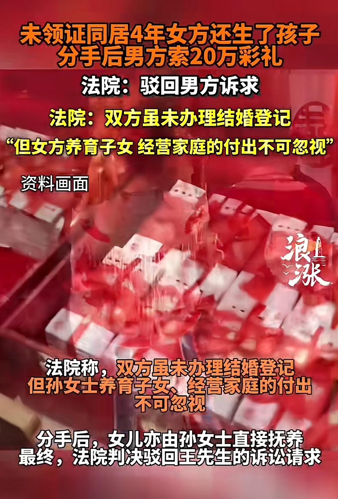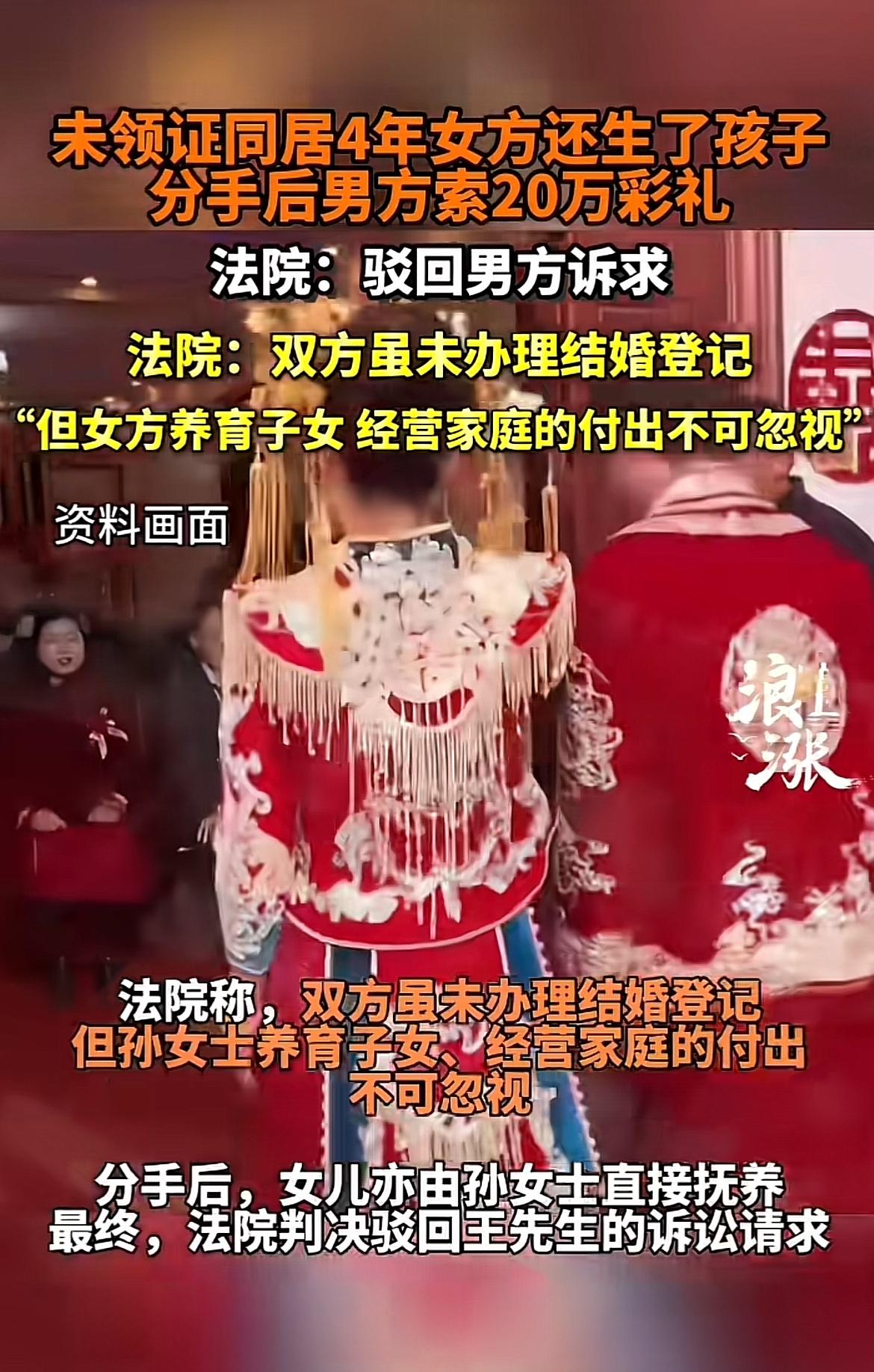 最近最高法发布的一起涉彩礼纠纷典型案例挺有意思。王某和孙某经人介绍后,王某给了20万彩礼,两人办了婚礼开始同居,还生了女儿,但没领证。4年后两人分手,王某起诉让孙某返还20万彩礼。 法院最终驳回了王某的请求。因为他们共同生活4年,彩礼部分已用于家庭日常开支,孙某养育子女、经营家庭付出很多,分手后女儿也由孙某抚养。要是仅因没领证就让女方返还彩礼,对女方太不公平。这案例也给大家提了个醒,彩礼问题得慎重,毕竟法律会综合考量各种因素来保障公平。