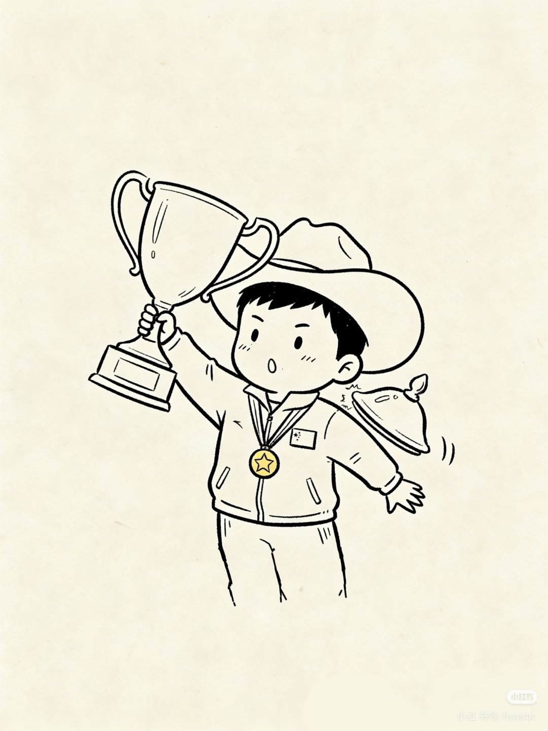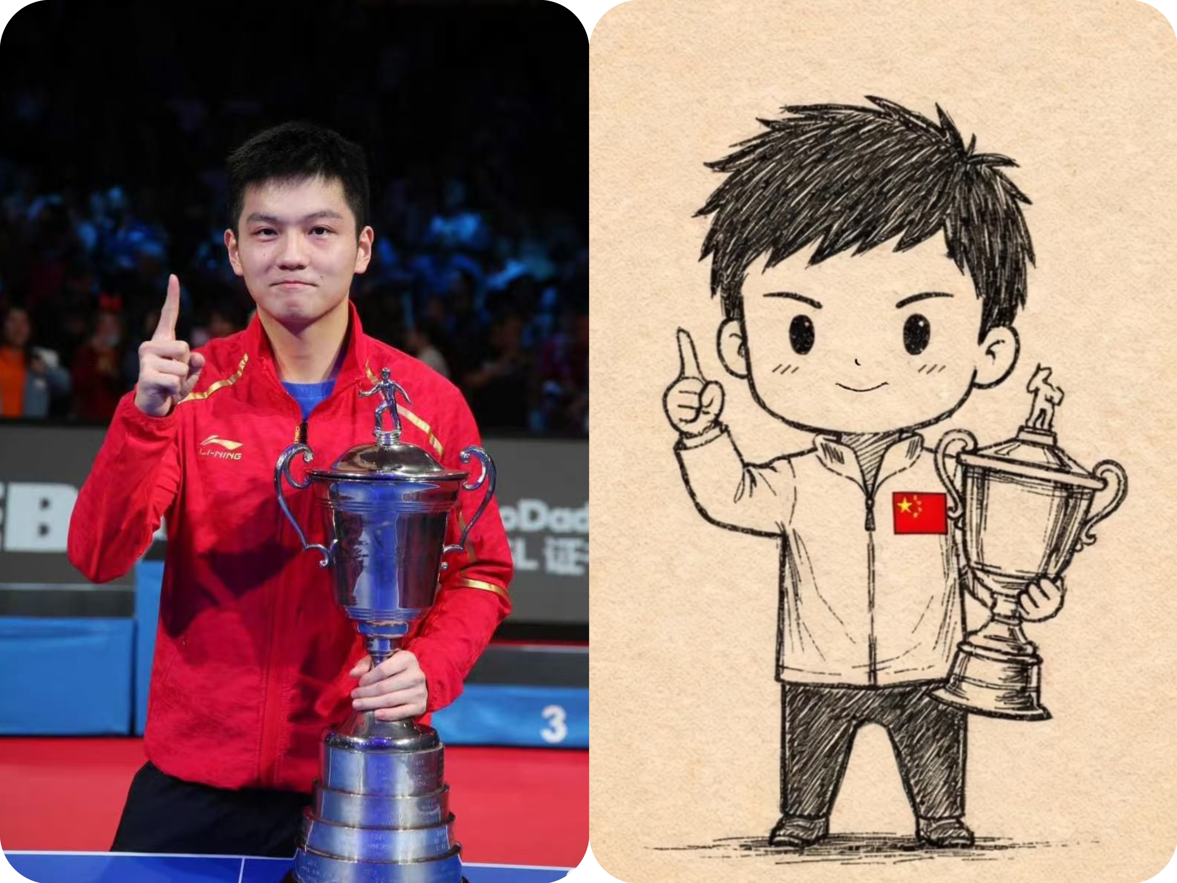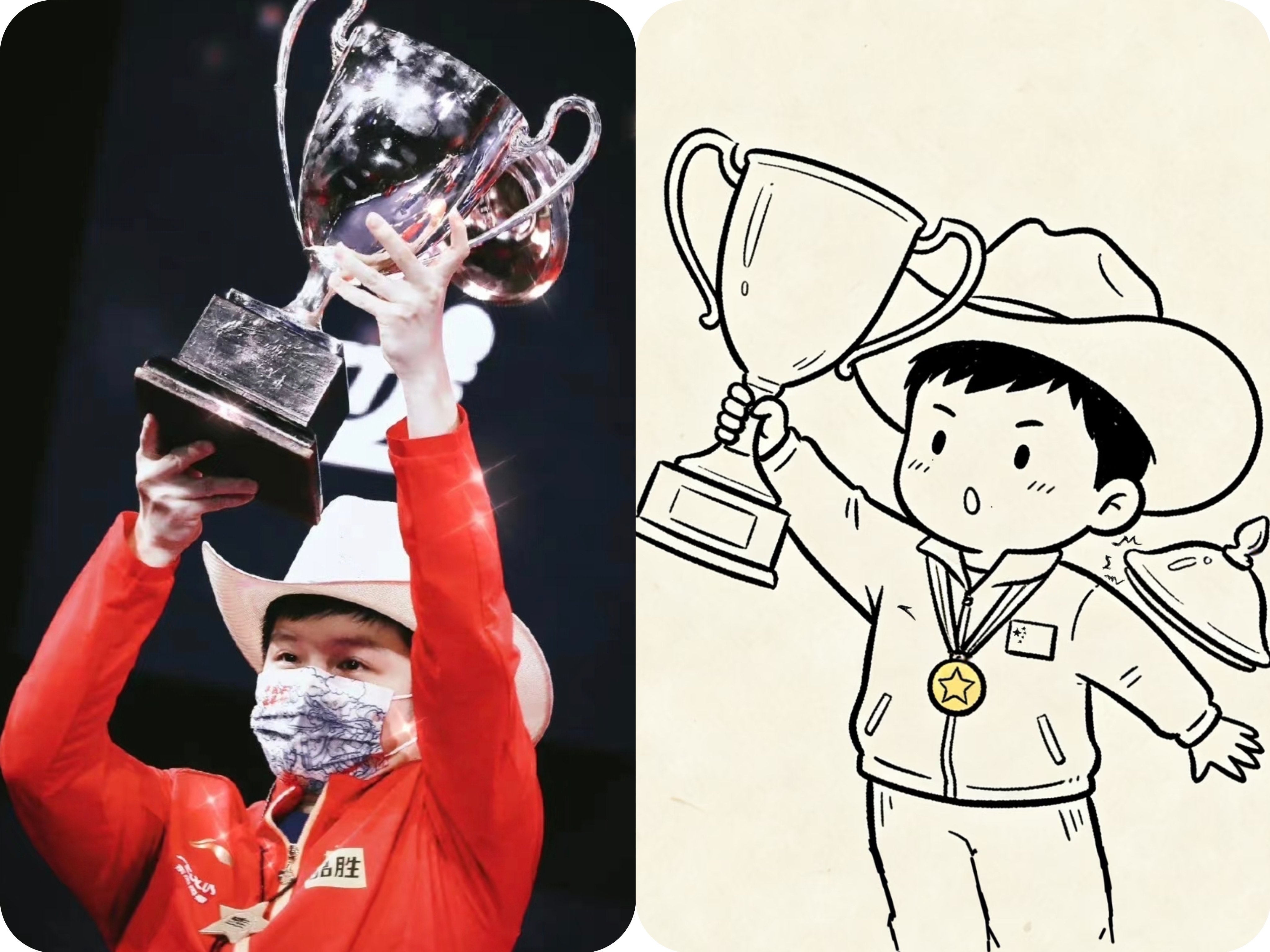 简笔画定格了樊振东两次举杯瞬间,可爱噗噗。