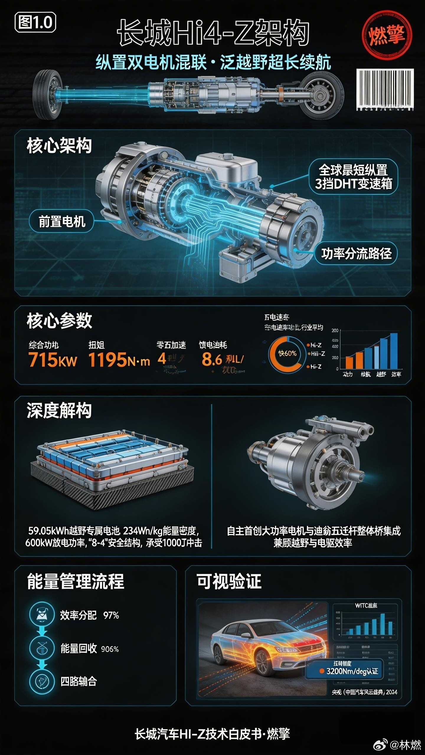长城Hi4-Z:纵置双电机混联架构,用功率分流+3挡DHT把城市通勤和轻越野揉进一台车。59度大电池撑起200km纯电续航,一周通勤零油耗;163kW快充15分钟补能120km,馈电油耗压到8.6L。前215kW后240kW双电机配2.0T/3.0T发动机,系统综合功率715kW,零百4秒级,馈电仍有5秒级表现。迪翁五连杆后悬架保留整体桥刚性,搭配“真4L”模式放大轮端扭矩20倍。这套方案用解耦四驱换来了电感体验,却用发动机全域直驱守住越野底线——和Hi4-T的分水岭,是“城市为主”与“越野为主”的场景切割。大v聊车