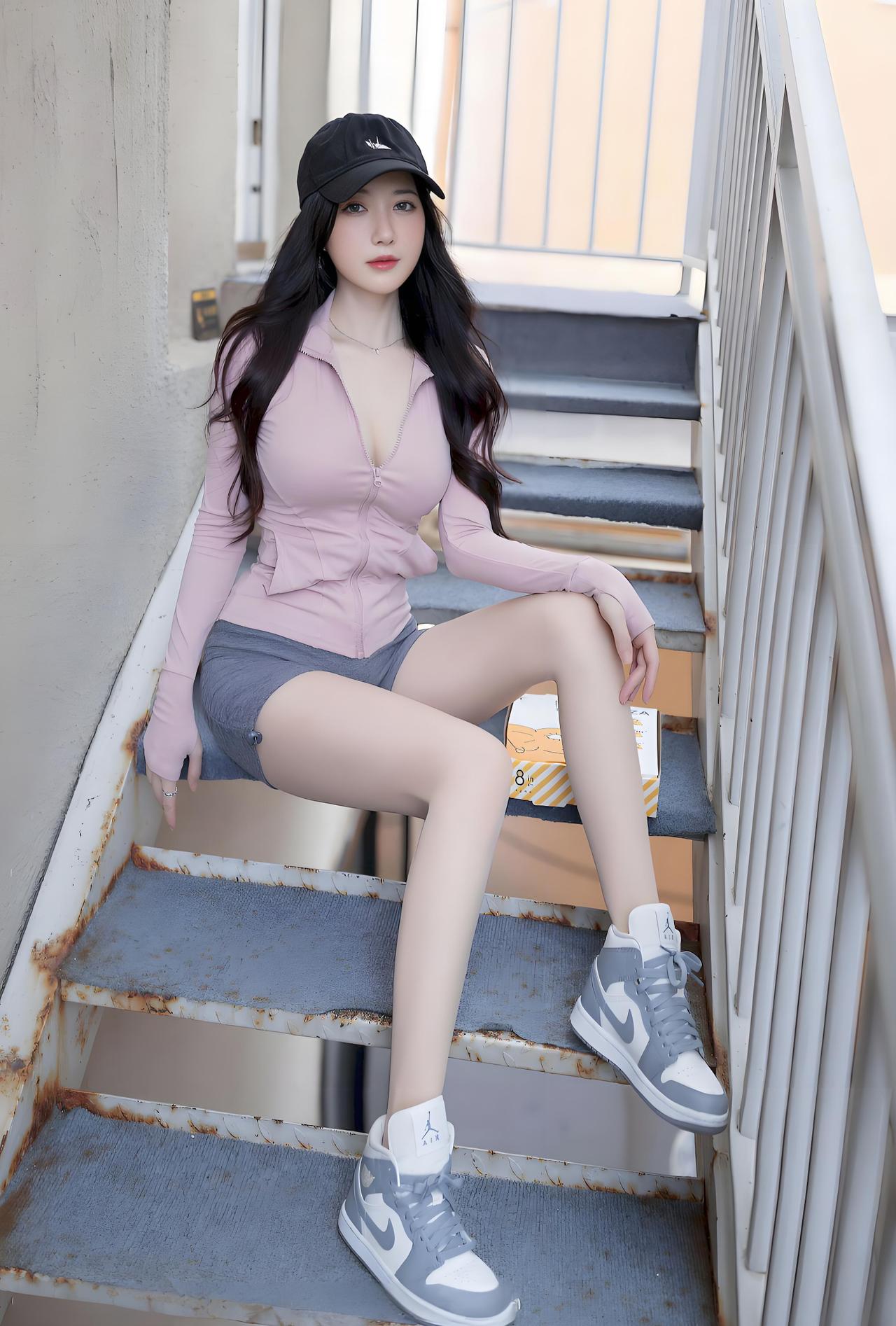 午后的老楼道飘着慵懒的风,粉灰穿搭的姑娘单膝跪在台阶上,黑帽檐下垂着的碎发,衬得