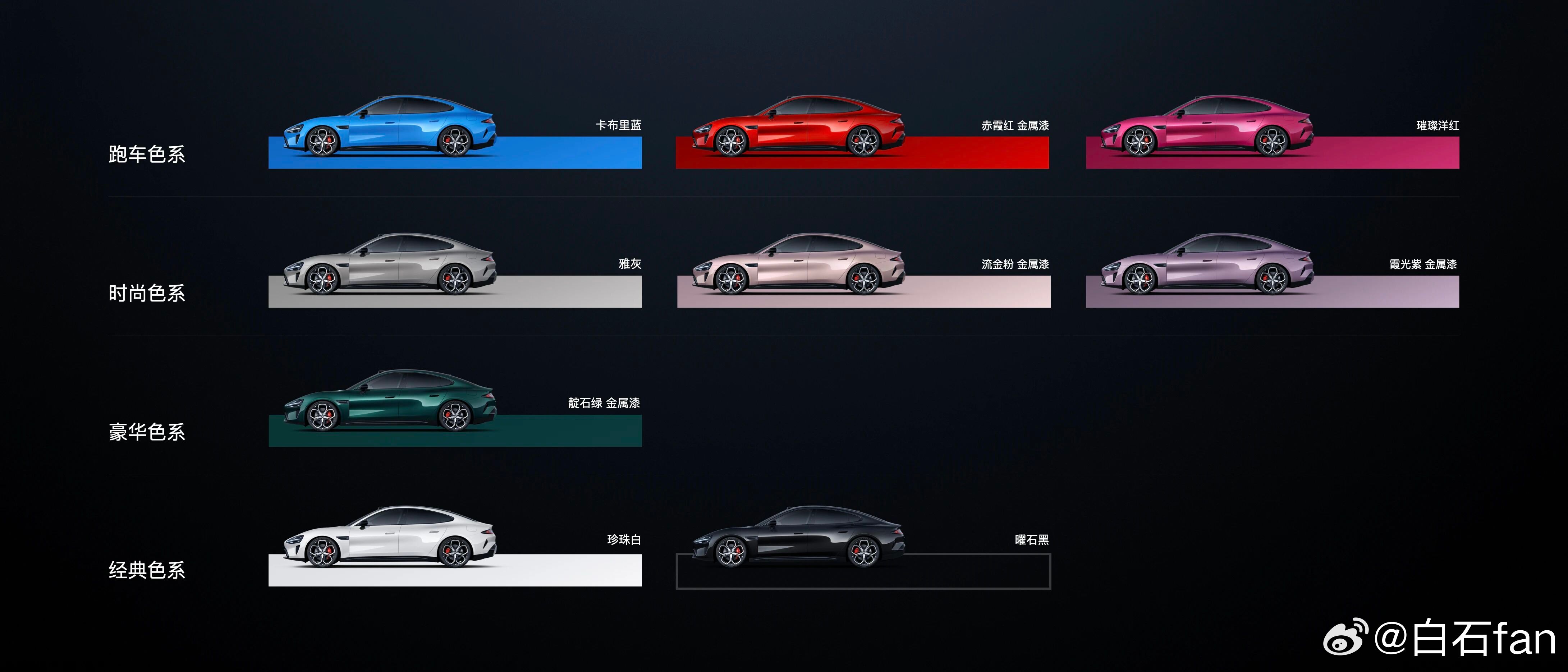 尚界Z7/Z7T 有十个颜色,八个轮毂新一代小米SU7 有9个颜色,六种轮毂,四