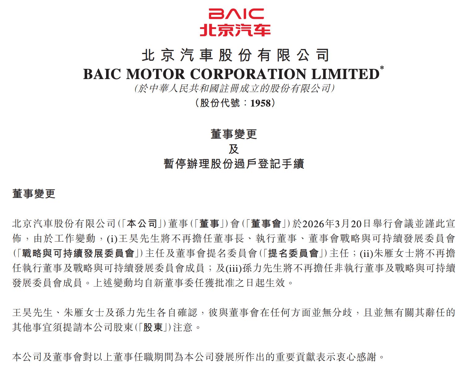 北京汽车公告,王昊将卸任董事长,提名张国富接任。