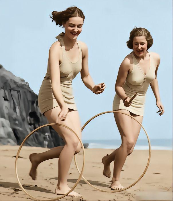 沙滩、海风、滚铁环, 这是上世纪的海边少女, 用最简单的游戏, 把快乐跑成了风的