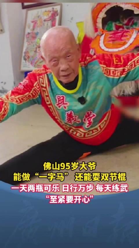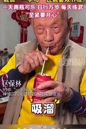 95岁大爷轻松劈一字马,烟酒不沾却天天炫可乐,网友:长寿秘诀全反了 都说养生要戒糖控饮、清淡忌口,这位95岁佛山大爷,偏偏用实力打破所有养生刻板印象,看完直接颠覆认知! 年过九旬的区保林大爷,身子骨比年轻人还硬朗,轻轻松松原地劈一字马,下稳挺拔毫不费力,日常打拳、耍棍、练气功,每天雷打不动晨练,步行上万步更是家常便饭,精气神秒杀不少青壮年。 最让人意外的是,他一辈子烟酒不沾,唯独戒不掉可乐,从年轻喝到95岁,一天两瓶是常态,完全不按“健康食谱”出牌。 不少人疑惑,高糖可乐咋没拖垮身体?大爷一句话点破真相:心态放宽,坚持动起来,比啥忌口都管用。 其实大爷的长寿,靠的是数十年如一日的自律运动和乐观心态,可乐只是他的小爱好,绝非养生秘方。大家千万别盲目模仿喝可乐,适合自己的作息和运动,才是真正的长寿密码。 95岁大爷能做一字马 称天天喝可乐