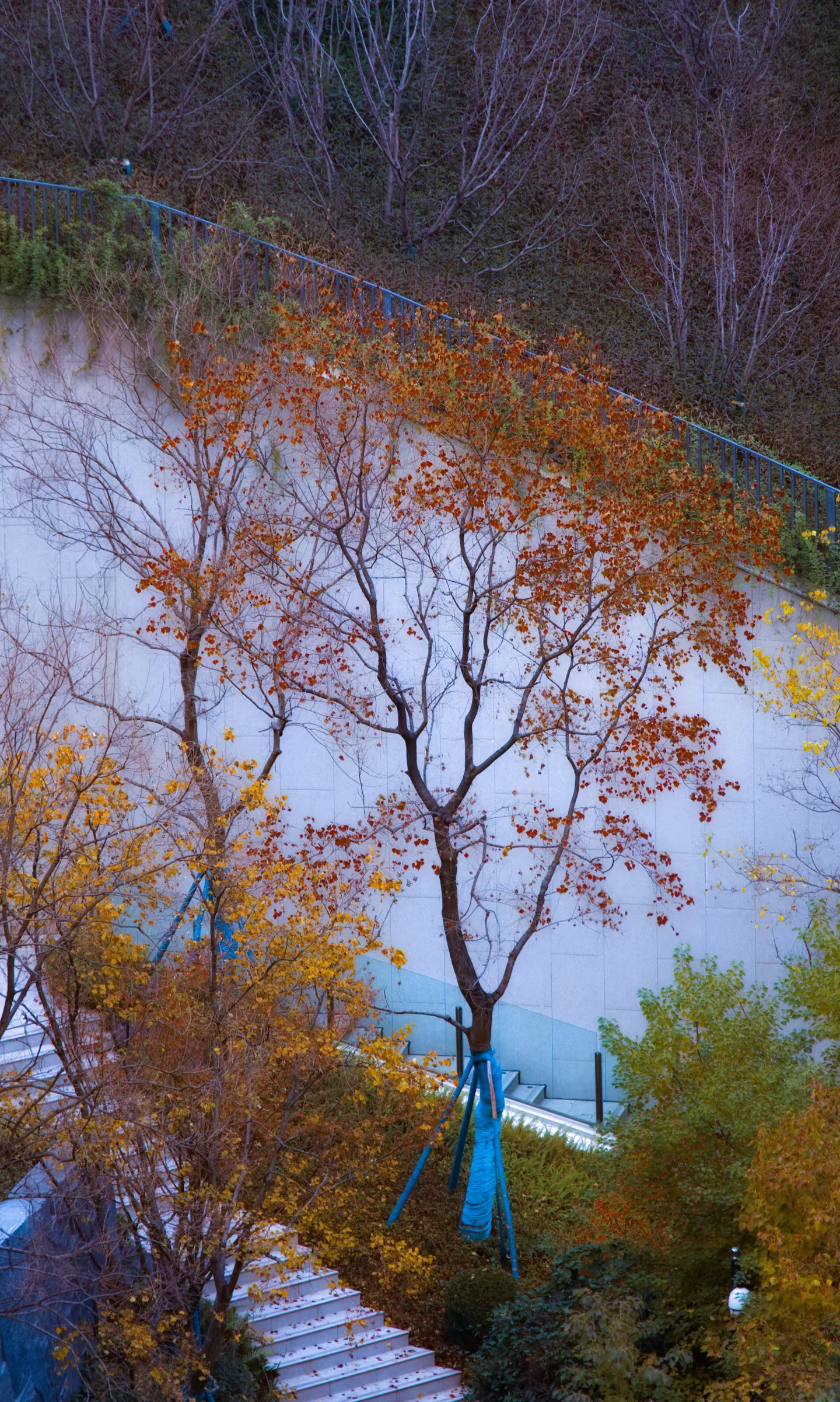 落叶在台阶上铺成天然的地毯