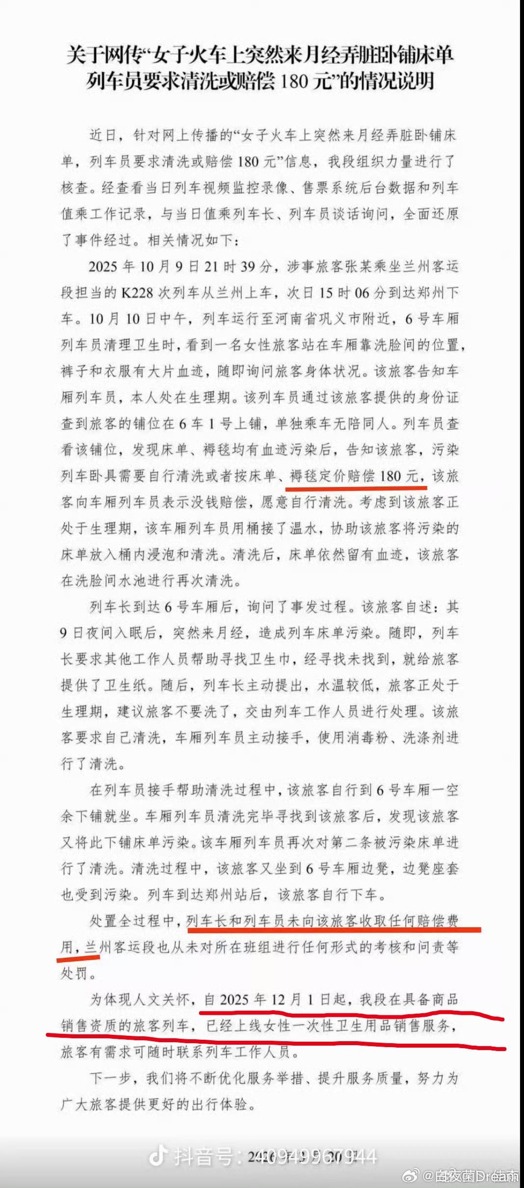 官方通报月经弄脏卧铺事件详情被污染的床单、褥毯要按定价赔偿180元。但最后并没有