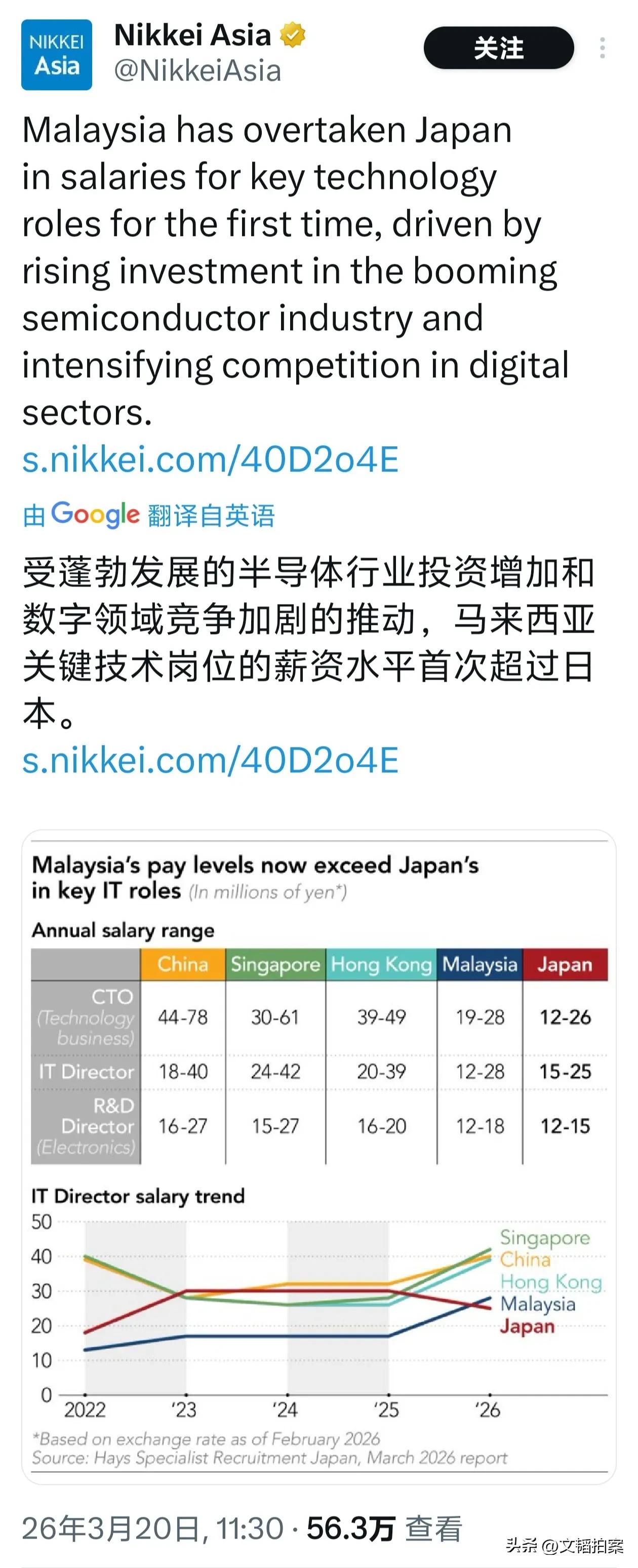 亚洲主要经济体IT总监薪资对比,马来西亚竟然超过了日本? 根据日本招聘机构最新发布的这份报告,今年2月,日本IT总监的平均薪酬已经被马来西亚超过,位居亚洲第五名了。 由此也可以看出,日本IT技术领域的不景气,难怪会在互联网和AI时代掉队。前些年,不是很多人说日本工匠精神吗?为啥在IT领域掉队了?日本薪资水平 马来西亚员工 IT工资 马来西亚人才