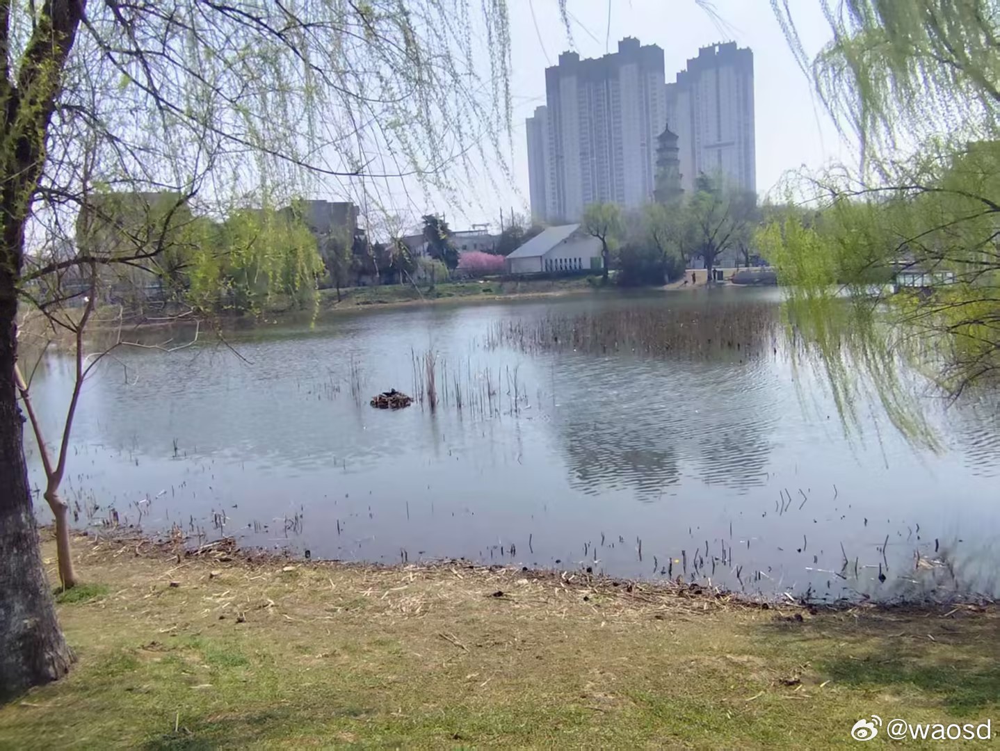 黑天鹅浮巢暖憩,文峰塔畔春意悠然暖阳下,阜阳市文峰塔畔的水面波光潋滟,一片芦苇错落分布在水面上。水中,一只黑天鹅正悠然卧于枯草编织的浮巢之上,修长脖颈弯成优雅的弧线。微风拂过,水面泛起细碎涟漪,芦苇摇曳,天鹅静憩,春意与生机在静谧中悄然流淌,勾勒出一幅灵动和谐的春日生态画卷。生物多样性 生物多样性保护 黑天鹅