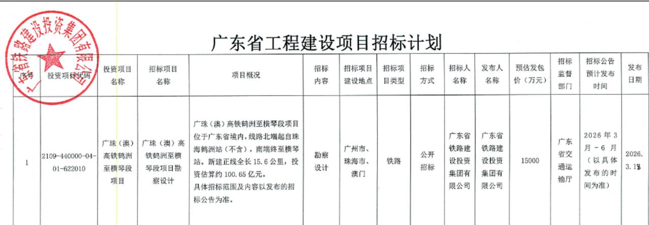 南珠(中)城际珠海段暂缓,现在广珠澳高铁珠海鹤洲至横琴段要来真格了! 1.南珠(中)城际,本来是想让广州(南沙)、中山、珠海三地通勤像坐地铁一样方便,目前南沙段大部分已经建成,中山段多座车站封顶,进度正常推进中,唯一的变数就是珠海段。 珠海段设站过密(规划10个车站)投资拉大,又因沿线楼盘居民担心噪音,环评不过,方案改来改去,一直定不下来。去年国家严格控制地方债务,与广珠城际平行的南珠(中)城际珠海段被打入冷宫,失去了最佳的开工时机。 2.广珠澳高铁则不一样,由广东与国铁集团推进,是带着“国家任务”来的。它的首要目标是将澳门、横琴拉进全国350公里/小时的高铁大网,是打通大湾区西岸交通瓶颈的战略工程。 据统计2025年横琴口岸出入境旅客超3034万人次,增长33%,单日客流纪录最高峰值达12.8万人次,如果能接入全国高铁网,对庞大的人流疏散有极大的促进作用。 本次勘探的线路是珠海鹤洲至横琴段,约15.6公里。