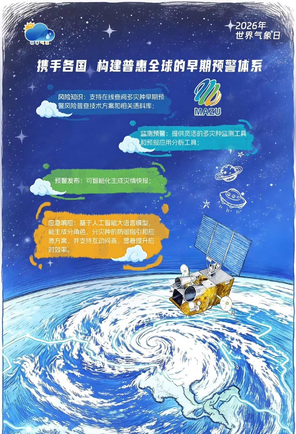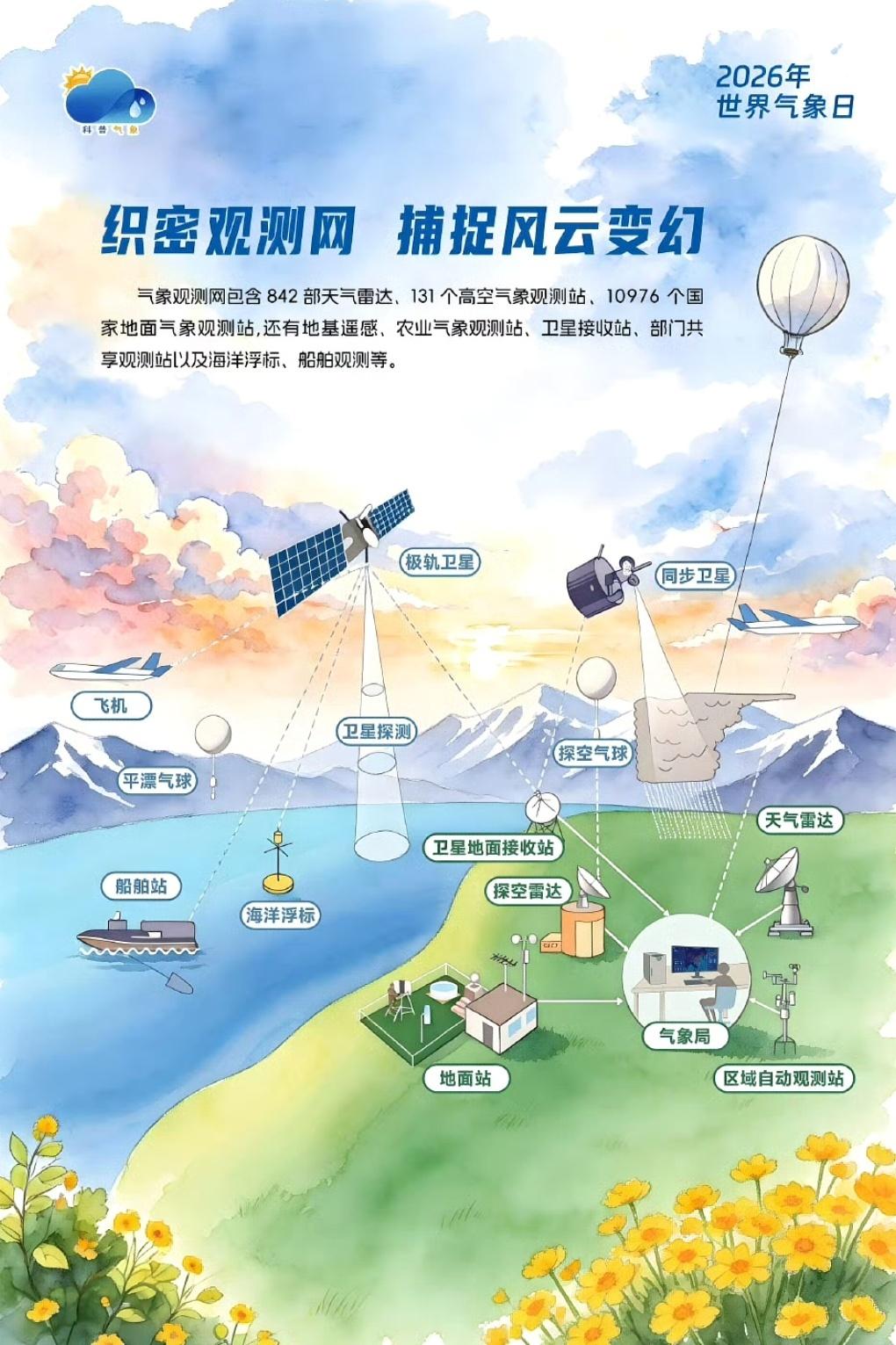 每年的3月23日是世界气象日。2026年,我们将迎来第66个世界气象日。今年世界气象日主题: 中文:测今日气象,护明日家园 英文:Observing Today, Protecting Tomorrow。 主题解读:观测,是气象工作的起点。从温度、湿度、气压、风速、降水,到卫星云图、雷达回波,每一组数据、每一次监测,都在为精准预报、防灾减灾、气候保护提供支撑。 守护,是气象工作的初心。用今日的观测数据,守护明天的平安家园;用科学的气象服务,守护每一个人的生产生活与生命安全。