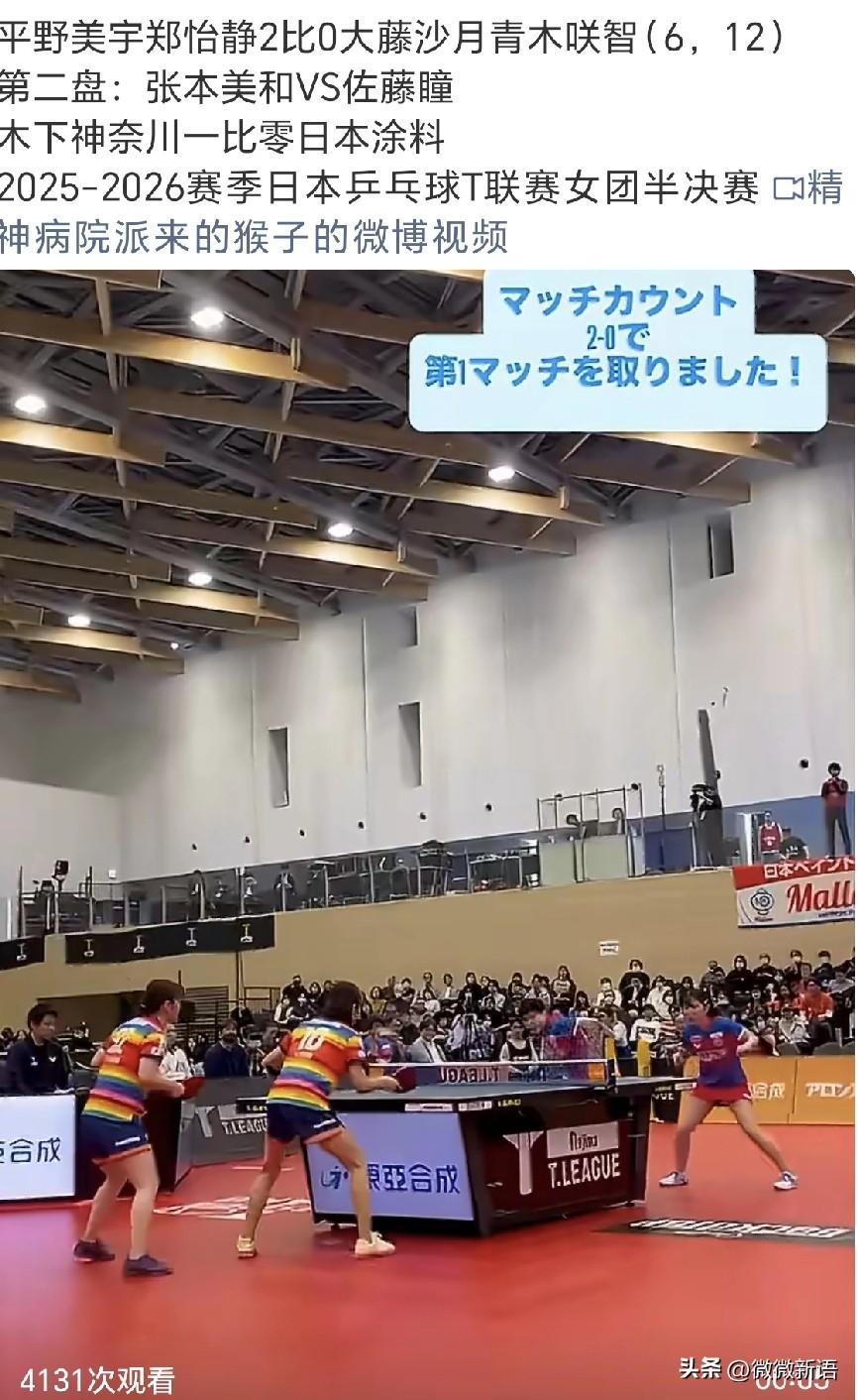 平野美宇和郑怡静的关系也很好呢。 郑怡静去日本打T联赛,她还给平野美宇带了凤梨酥,平野美宇发文说:“太好吃,谢谢!”然后看到郑怡静也发文,还发了和平野的合影,郑怡静说:“可爱又贴心的队友miu,上次逛街还有想到我,很感动,接下来的比赛一起加油!” 在日乒T联赛女团半决赛前,平野美宇还接受了采访,平野美宇说:“我们球队还从未实现过两连冠。今年的目标就是卫冕成功,所以首先想赢下明天的半决赛。”看到平野美宇变漂亮了呢,昨天她和张本美和还互动了,俩个小女孩儿笑的很开心。 今天的日本T联赛女团半决赛,第一盘平野美宇/郑怡静2-0赢了,第二盘女单张本美和3-2赢了佐藤瞳,俩人这五局比赛打了挺长时间,不过张本美和就打一场,木下第三盘比赛是迪亚兹上场,第四盘单打是平野美宇上场,还是木下俱乐部的实力更强一些!