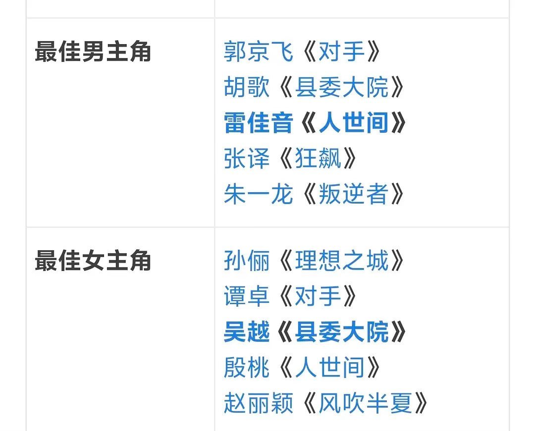 以男女主提名来看,近六年的提名中,第25届(天盛长歌陈坤,知否赵丽颖)第26届(庆余年张若昀,长安十二时辰雷佳音)第29届(长相思杨紫)第30届(庆余年2张若昀,国色芳华杨紫)确实有古装名额而第27届、第28届都是没有古装名额的。
