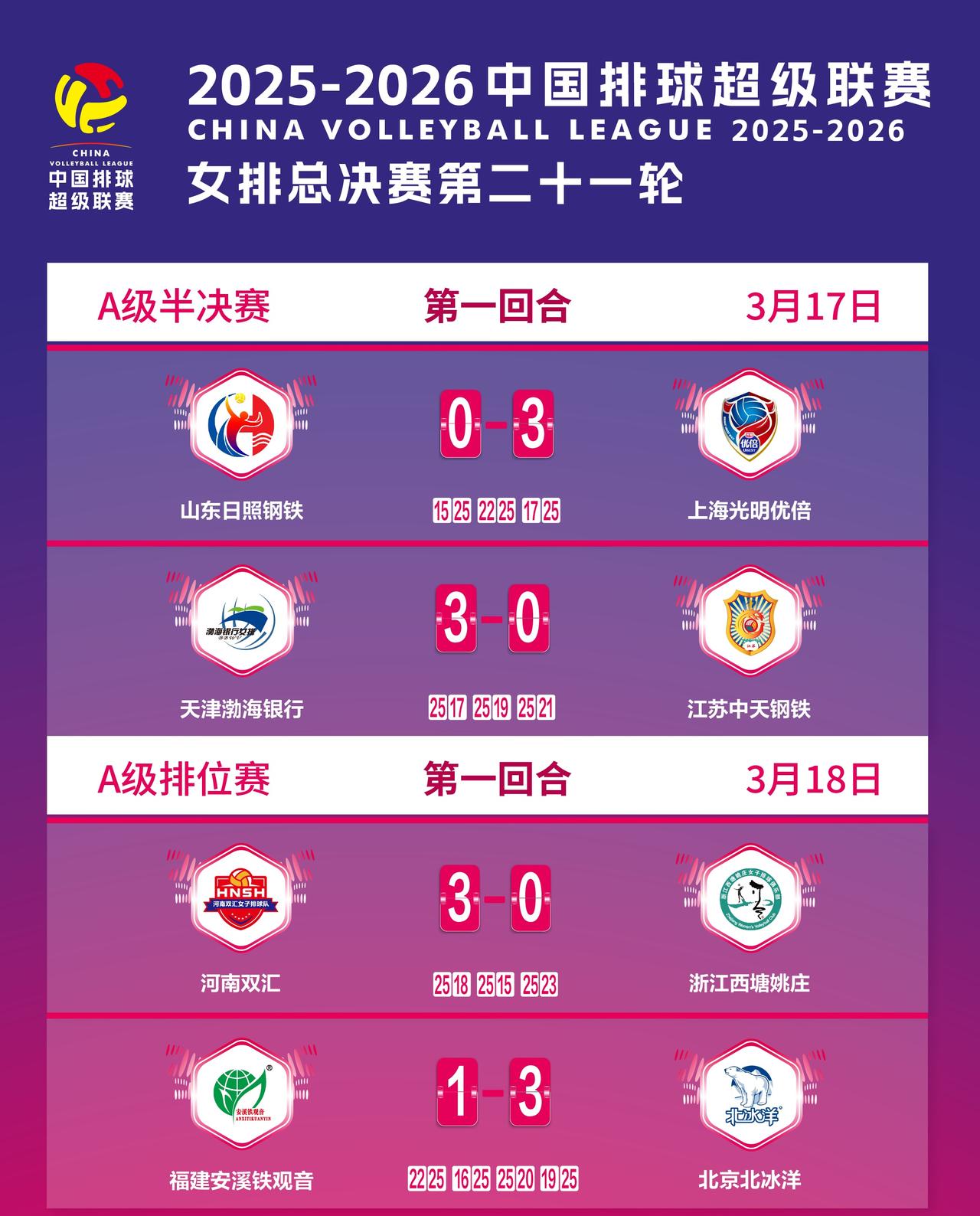 【5+直播苏津生死战!女排联赛3月21日赛程】 中国女排超级联赛半决赛第二回合生死战 15:30 上海vs山东 16:30 江苏vs天津 山东和江苏已无退路 必须拿下比赛才能进入金局制胜 CCTV5+计划直播苏津生死战 5-8名排位赛也是进入终极淘汰 15:30 北京北冰洋 vs 福建安溪铁观音 19:00 浙江西塘姚庄 vs 河南双汇 观赛渠道:央视频、央视体育客户端 腾讯体育、中国排球超级联赛微博 首回合赛果见图③