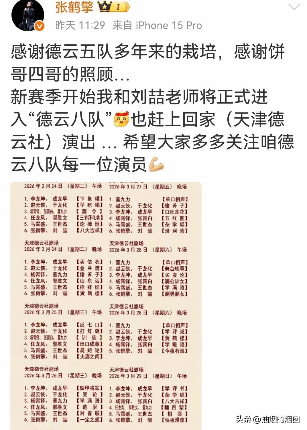 张鹤擎调入德云八队,后备队长。 张云雷为德云八队队长,但这队长名存实亡长期脱岗,