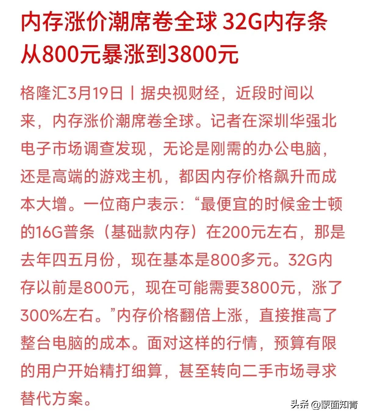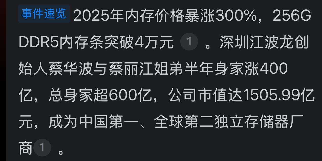半年暴赚400亿!深圳华强北姐弟赚了400亿,他们抓住了泼天富贵! 最近全球内存价格疯涨,32G的条子能从800元冲到3800元,装台电脑成本飙升。就在大家叫苦不迭时,一对深圳姐弟的身家正以惊人速度膨胀。 他们就是深圳江波龙的创始人蔡华波与蔡丽江姐弟。就在这波席卷全球的“内存风暴”中,他们半年来身家暴涨400亿元,总身家已超过600亿! 其公司市值也飙升至1500多亿元,一跃成为中国第一、全球第二的独立存储器厂商。 他们的财富火箭,是靠AI风口点燃的。全球AI爆发,对高性能存储(HBM)的需求呈指数级增长。上游巨头(如三星、SK海力士)纷纷将大部分先进产能转向HBM,导致普通内存产能锐减、价格飞涨。而江波龙,正好站在了这个供应链的关键位置上,精准地接住了这“泼天的富贵”。 所以,这不仅是内存涨价的故事,更是一个关于踩中时代脉搏,财富急剧重配的惊人案例。当你在为涨价精打细算时,有人已经凭借敏锐的商业嗅觉和产业位置,实现了财富的超级跃迁。 抓住机会,比埋头苦干有时更有价值!希风口来了,你在做什么?