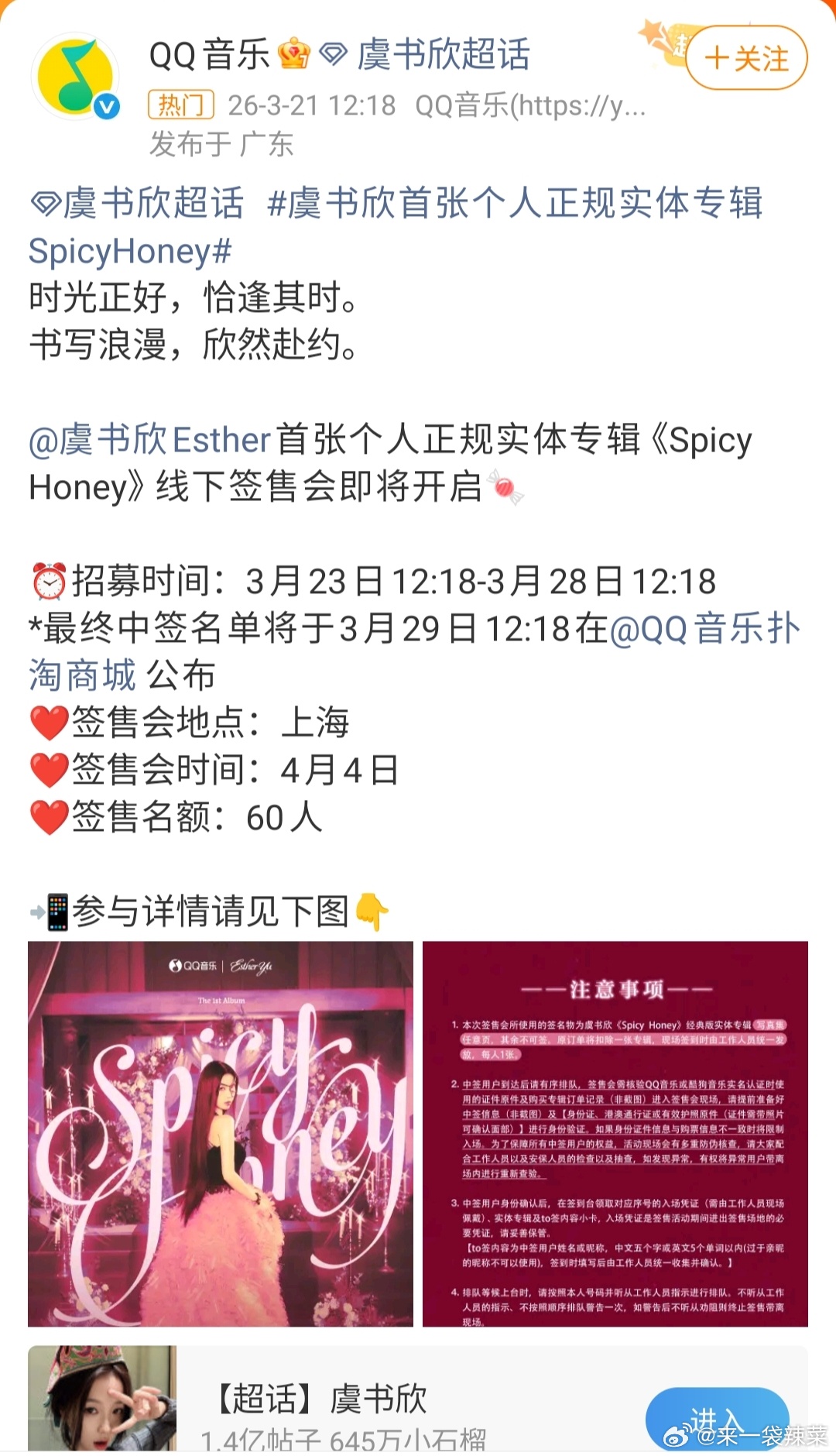 虞书欣专辑签售会虞书欣首张个人专辑《Spicy Honey》于2026年4月4日在上海举办线下签售会,期待吗