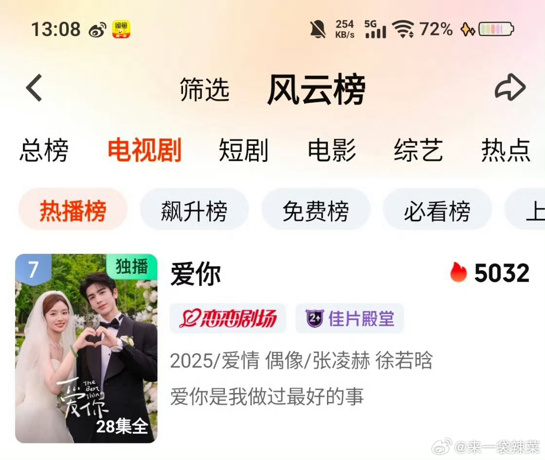 张凌赫 徐若晗《爱你》爱奇艺站内热度还在爆,太厉害了