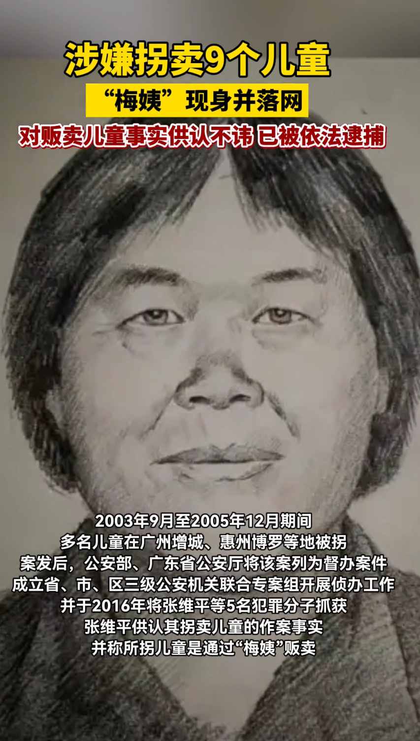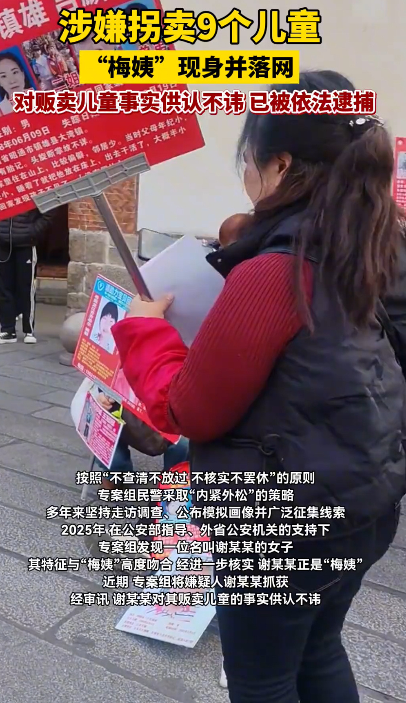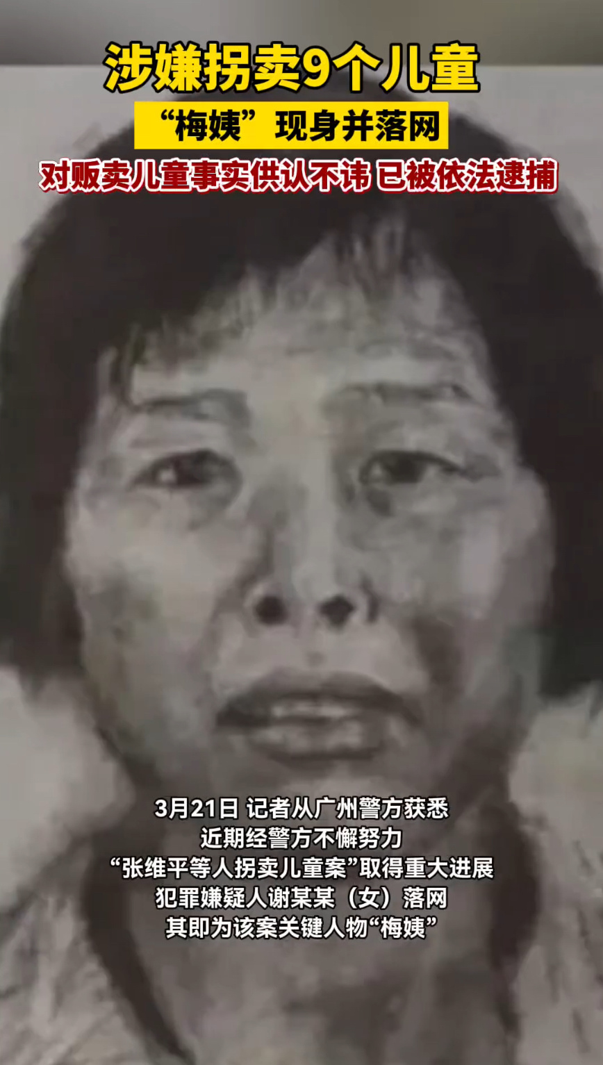 梅姨被逮捕3月21日,广州警方重磅通报:潜逃20余年的拐卖儿童案核心嫌疑人“梅姨”(真实身份谢某某)被抓获归案,案件取得突破性进展。2003至2005年,谢某某作为张维平团伙关键中间人,在粤多地中转贩卖9名1—3岁男童并抽成牟利,致多个家庭破碎。主犯张维平等5人已于2023年被核准死刑并执行。