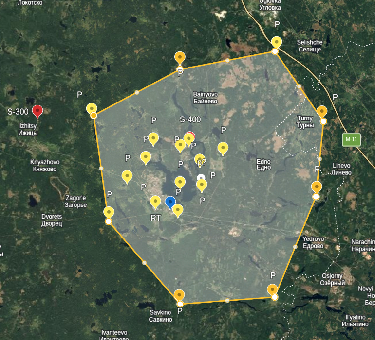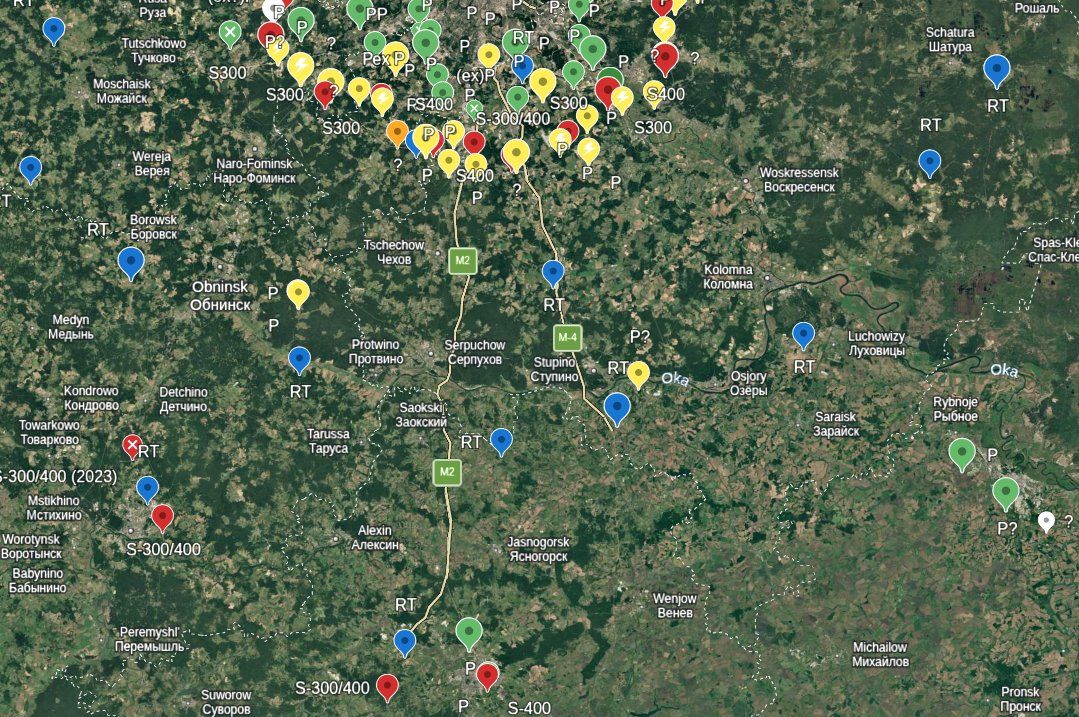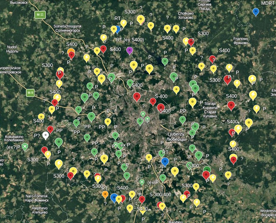 烽火问鼎计划每天认识一件兵器 去年10月的OSINT分析(图1)指出,莫斯科的防空圈由18个远程预警雷达阵地,25 个S-300/S-400防空导弹发射阵地,以及约50个围挡式“铠甲”防空导弹阵地和约30个高架式“铠甲”防空导弹阵地构成。