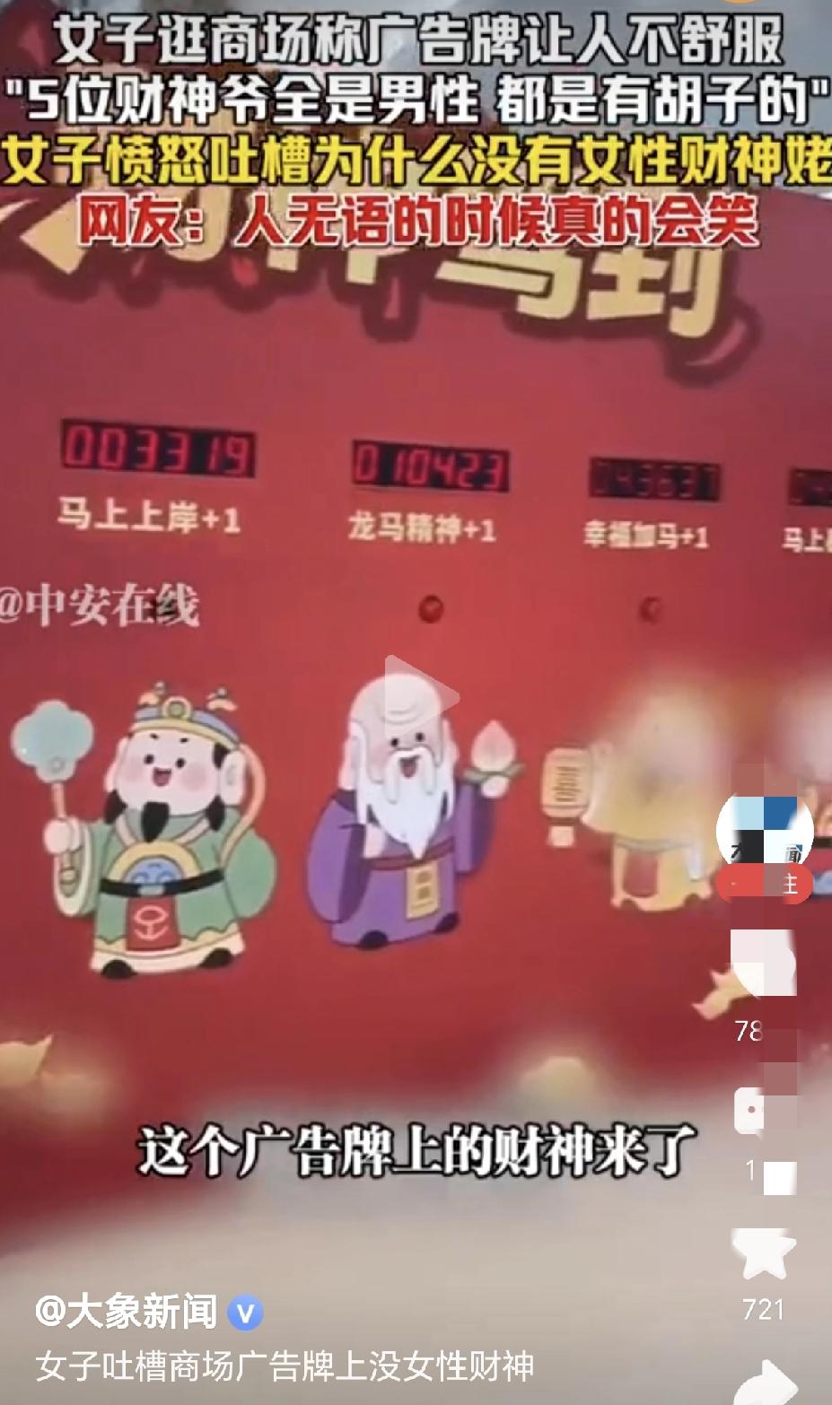 商场里画了5个男财神,没画女财神。这都能挑出毛病来了,现在有些女的拳打得真是密不透风!