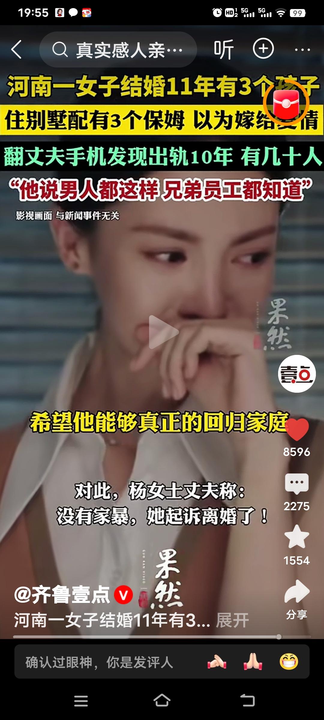 河南郑州的杨女士,结婚11年,有3个孩子,住着别墅还有3个保姆,本以为是嫁给了爱情。她和丈夫在国外留学相识后结婚,一直觉得生活幸福。 然而,半年前她觉得丈夫不对劲,回家越来越晚,而且还在她早上醒来发现丈夫还在发信息,而且也不和她在一起了。翻丈夫手机,发现其中一个微信号几乎全是女人,开房记录,色情视频。其中有一个包养的还协议生孩子,杨女士说这个女人勾引她丈夫,女子却说勾引他的多的去了。 原来杨女士的朋友都知道,唯有杨女士像个傻子一样不知道!杨女士去理论,丈夫却称“男人都这样,在外面玩正常” 杨女士未来该何去何从。 提出离婚,她丈夫却说,没有家暴她要离婚了!他还真挺有能耐的啊,那么多女的养他了。真心希望他能悔过自新,早日回归家庭 好好的过日子!