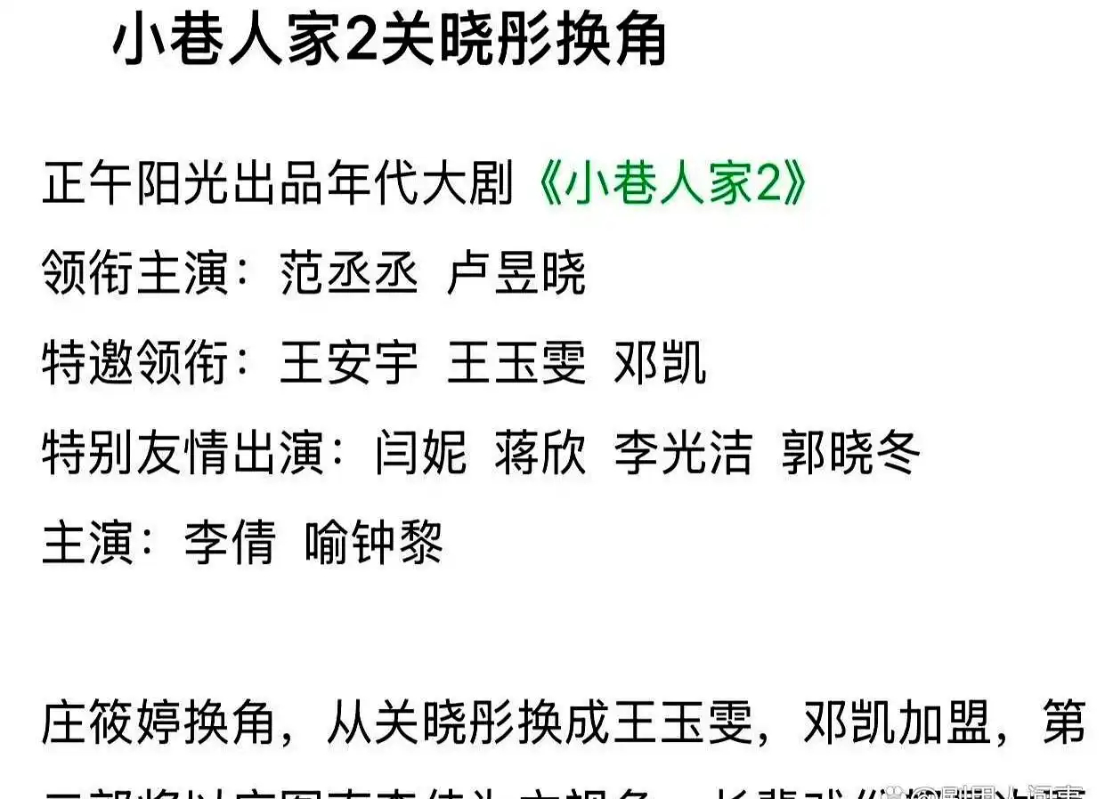 小巷人家2:演员阵容调整:关晓彤角色由庄筱婷替代,王玉雯也将加入主要阵容。第二部