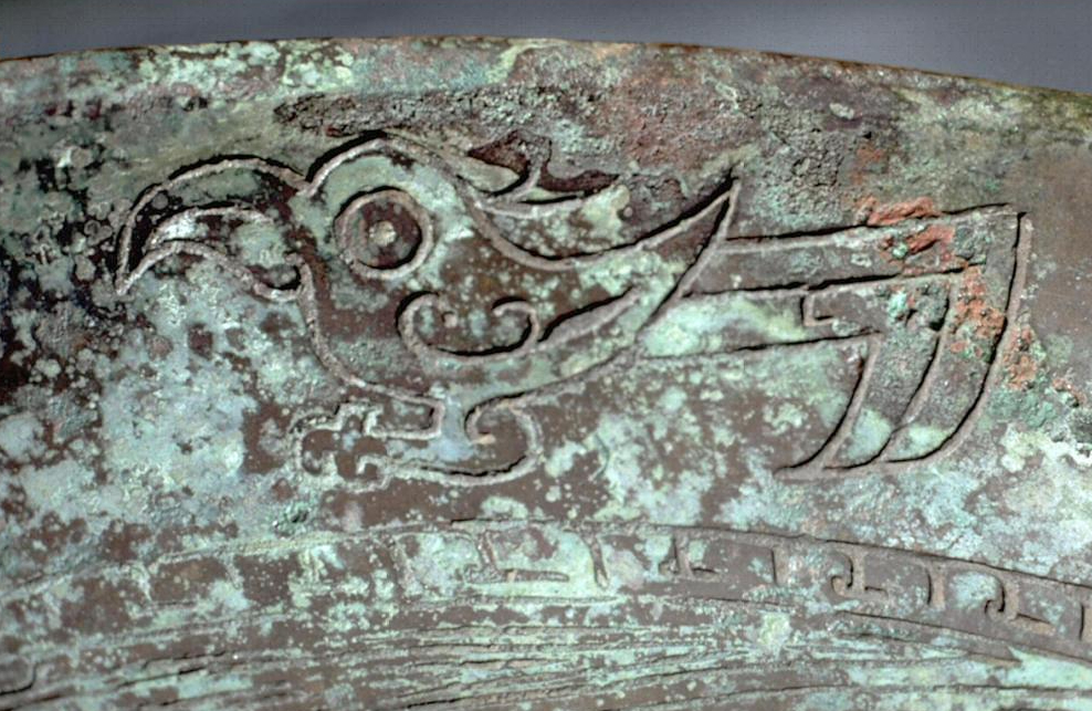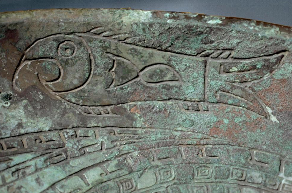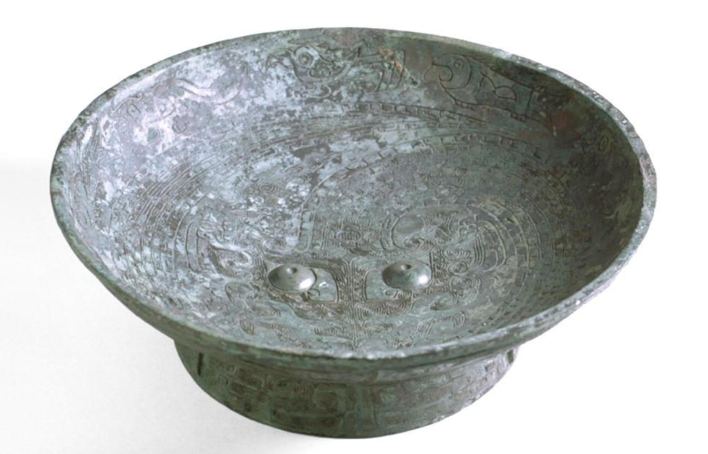 每天一件青铜器 旧金山亚洲艺术博物馆藏商晚期龙纹大盘, 纹饰是比较经典的配置. 盘中心一条鳞纹盘踞的柱角大龙, 龙首几乎与常见的饕餮兽面一样. 卷曲的身躯周围还填充点缀了三条小龙. 靠近口沿则是一周三组龙鸟鱼纹. 向上的卷鼻, 向前的勾喙, 向下的勾嘴都都有变化,又错落有致
