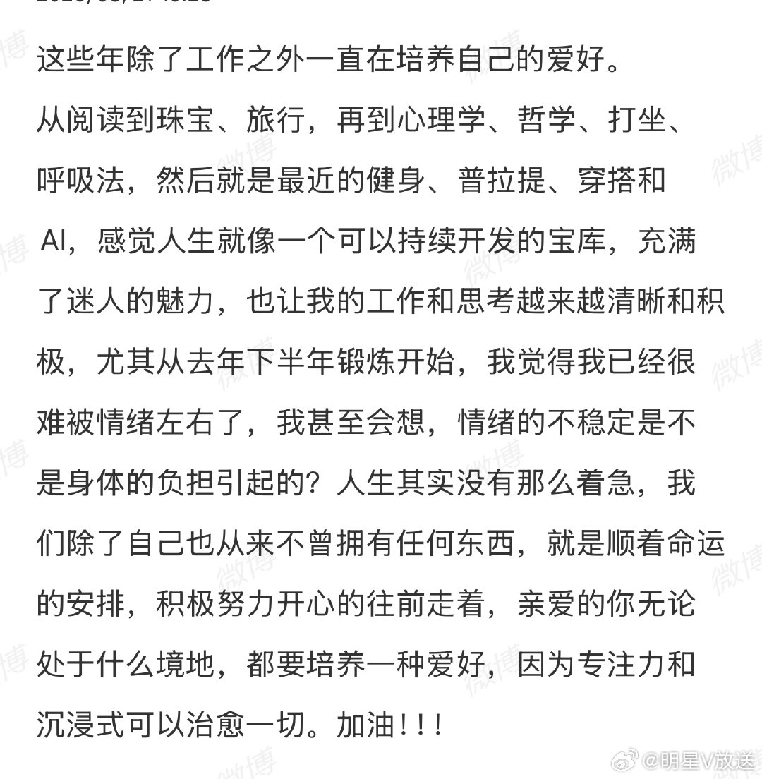 于正说AI不会让影视行业完了于正 AI不会让内娱完蛋 于正发文谈AI与行业心态,直言不必焦虑 AI 会让内娱完蛋,就像戏曲、影视更替一样,新时代自有新娱乐方式,行业人只需专注当下、打磨专业、养好身体。他还分享自己工作中探索 AI 新技术,生活里坚持健身、普拉提,培养阅读、珠宝等多元爱好,呼吁大家用爱好治愈内耗,拥抱变化积极向前。