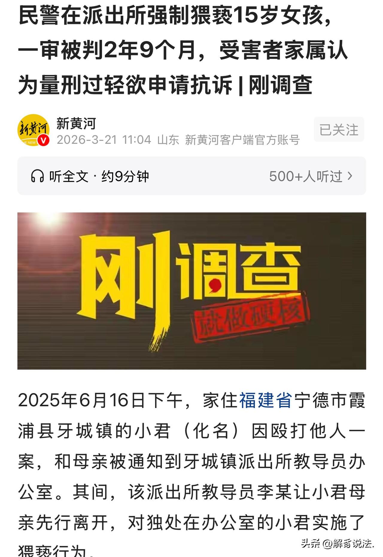“必须严惩不贷!”福建宁德,15岁女孩和母亲被叫到派出所做笔录,期间,教导员支走了其母亲,把女孩单独留在在办公室里,以拘留为威胁,并对其实施了猥亵行为。事后,女孩父亲愤怒找教导员对峙,对方死不承认,还反咬一口,说他污蔑警察,甚至叫嚣着说,让他带妻女去派出所对质。男子报了警,警方找到实质性证据,男子抵赖不成,被判处有期徒刑2年9个月。女孩父亲不服,认为判得太轻了,打算继续维权,为女儿讨公道。 张先生家里有两个孩子,女儿小君出事那年才刚满15岁,本该是无忧无虑的年纪。 他们一家在福建牙城镇生活了近20年,安安稳稳过日子,原本平淡又幸福,谁也没料到,一场噩梦会突然砸在这个普通家庭上,彻底改变了他们一家的生活, 2025年6月16日下午,张先生正在福鼎开车忙活生计,手机突然接连响起,先是妻子慌慌张张打来电话,哭着说女儿在派出所被人欺负了。 张先生当场就懵了,他不敢相信妻子的话,派出所是保护老百姓的地方,女儿去做笔录怎么可能出事? 他只当是孩子受了委屈乱说。 直到电话那头传来女儿撕心裂肺的哭声,他才彻底慌了神,浑身发凉。 张先生强压着怒火,立刻给派出所涉事的教导员李某打电话对峙,可李某不仅矢口否认,还反咬一口:你这是污蔑警察。 甚至叫嚣着说,让他带妻女去派出所对质。 张先生暴怒,一边开车往霞浦赶,一边直接向宁德市公安局报了警。 想想女儿受到这样的伤害,当父亲心里的愤怒无法言说。 他发誓,一定要为女儿讨个公道,让恶人受到应有的惩罚。 原来,事发当天下午,小君因为和别人发生肢体冲突,被母亲陪着到牙城镇派出所做笔录。 期间,教导员李某故意把小君母亲支开,单独留下15岁的小君,还以要拘留她作为威胁,在办公室里对小君实施了极其恶劣的强制猥亵行为。 小君母亲做梦也不会想到在派出所会发生这样的事,不然打死也不会离开女儿半步。 当小君回到家里,把自己锁在房间里,失声痛哭,小君母亲意识到不对劲,在她的追问下,女儿才道出实情。 小君母亲难以置信,这样的事会发生在自己女儿身上,她愤怒,自责,最后,打电话给在外的丈夫。 警方介入后,通过物证鉴定,在李某的办公室、衣物以及小君的鞋子上,都检出了李某的生物痕迹,证据确凿,李某很快被带走调查。 2026年3月16日,法院对此案作出一审判决,认定李某身为警务人员,利用职务之便猥亵未成年人,手段恶劣,构成强制猥亵罪,判处有期徒刑两年9个月,李某当庭没有提起上诉。 这样的判决结果,让张先生一家彻底寒了心。 更让人心疼的是小君,自从出事以后,孩子精神彻底垮了,夜夜做噩梦,多次拿刀自残,手臂上布满了伤口,还先后四次离家出走,如今一个人跑到江西打工,不敢再回到充满伤害的家乡。 镇上的流言蜚语满天飞,妻子承受不住巨大的压力,被迫回了四川老家,家里的店铺也只能关门,原本幸福的一家人,被弄得支离破碎。 直到现在,李某及其家属、涉事派出所,都没有向小君一家作出过正式道歉。 看着女儿被折磨得不成样子,张先生心痛不已,他已经准备向检察院申请抗诉,还要委托律师提起民事诉讼索要赔偿。 在他心里,女儿遭受的是一辈子都抹不掉的伤害,这份公道,他无论如何都要坚持讨到底。 《刑法》第236条规定:以暴力、胁迫或者其他方法强制猥亵他人或者侮辱妇女的,处五年以下有期徒刑或者拘役。聚众或者在公共场所当众犯前款罪的,或者有其他恶劣情节的,处五年以上有期徒刑。 猥亵儿童的,处五年以下有期徒刑;有下列情形之一的,处五年以上有期徒刑:(一)猥亵儿童多人或者多次的;(二)聚众猥亵儿童的,或者在公共场所当众猥亵儿童,情节恶劣的;(三)造成儿童伤害或者其他严重后果的;(四)猥亵手段恶劣或者有其他恶劣情节的。 本案中,李某身为警察,利用职权胁迫15岁女孩,还存在生殖器侵入口腔等严重行为,属于“手段恶劣”。 按规定,猥亵未成年人、手段恶劣的,量刑应在五年以上。法院考虑其认罪认罚从轻判了2年9个月,家属觉得太轻,因为孩子已出现自残、多次离家出走,这属于“造成严重后果”,对孩子的伤害是一辈子的。 家属申请抗诉、要求民事赔偿,是在依法为孩子争取应有的公道,法律不仅要罚恶人,更要护住孩子的一生。 此事曝光后,网友义愤填膺,呼吁必须严惩不怠。 这个教导员简直禽兽不如,判轻,在办公办案场所作案,知法犯法,受害者又是未成年。 怎么没有提到赔偿金?虽然是没有强奸罪严重,但是已经严重影响了她后面的人生,判刑10年也不过分! 这不是应该罪加一等吗!执法人员犯法,这不明知故犯吗!比普通人更可恨啊!