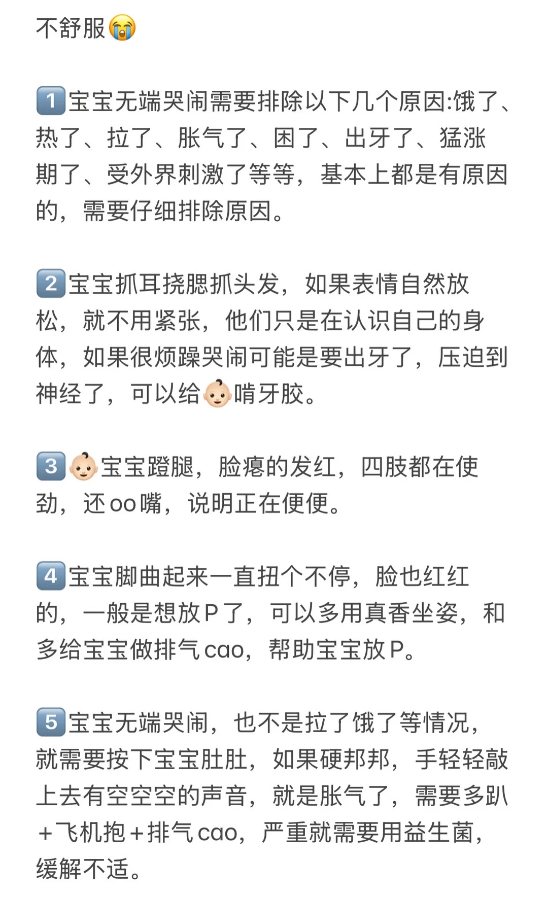 1️⃣宝宝无端哭闹需要排除以下几个原因:饿了、热了、拉了、胀气了、困了、出牙了、猛涨期了、受外界刺激了等等,基本上都是有原因的,需要仔细排除原因。