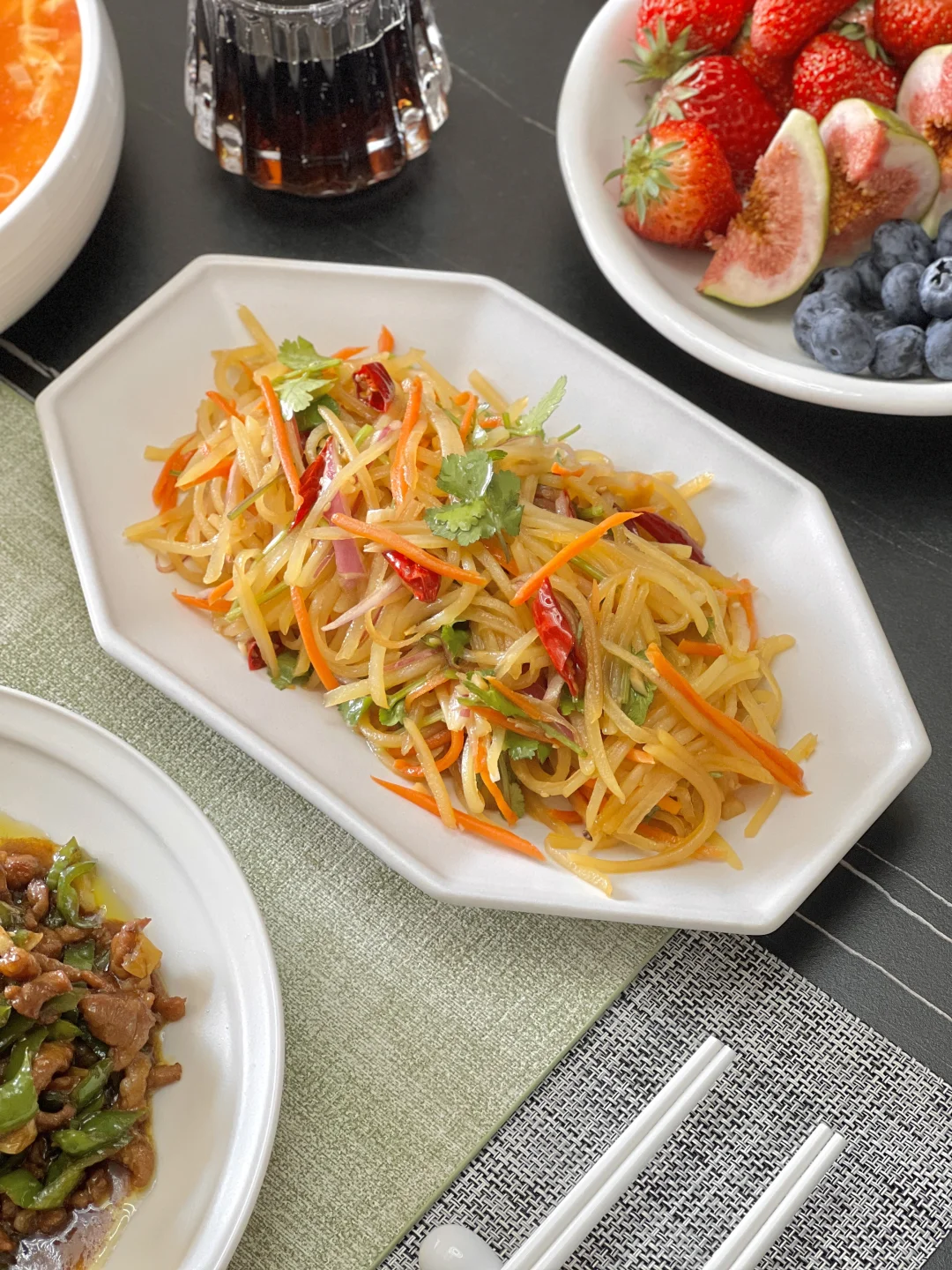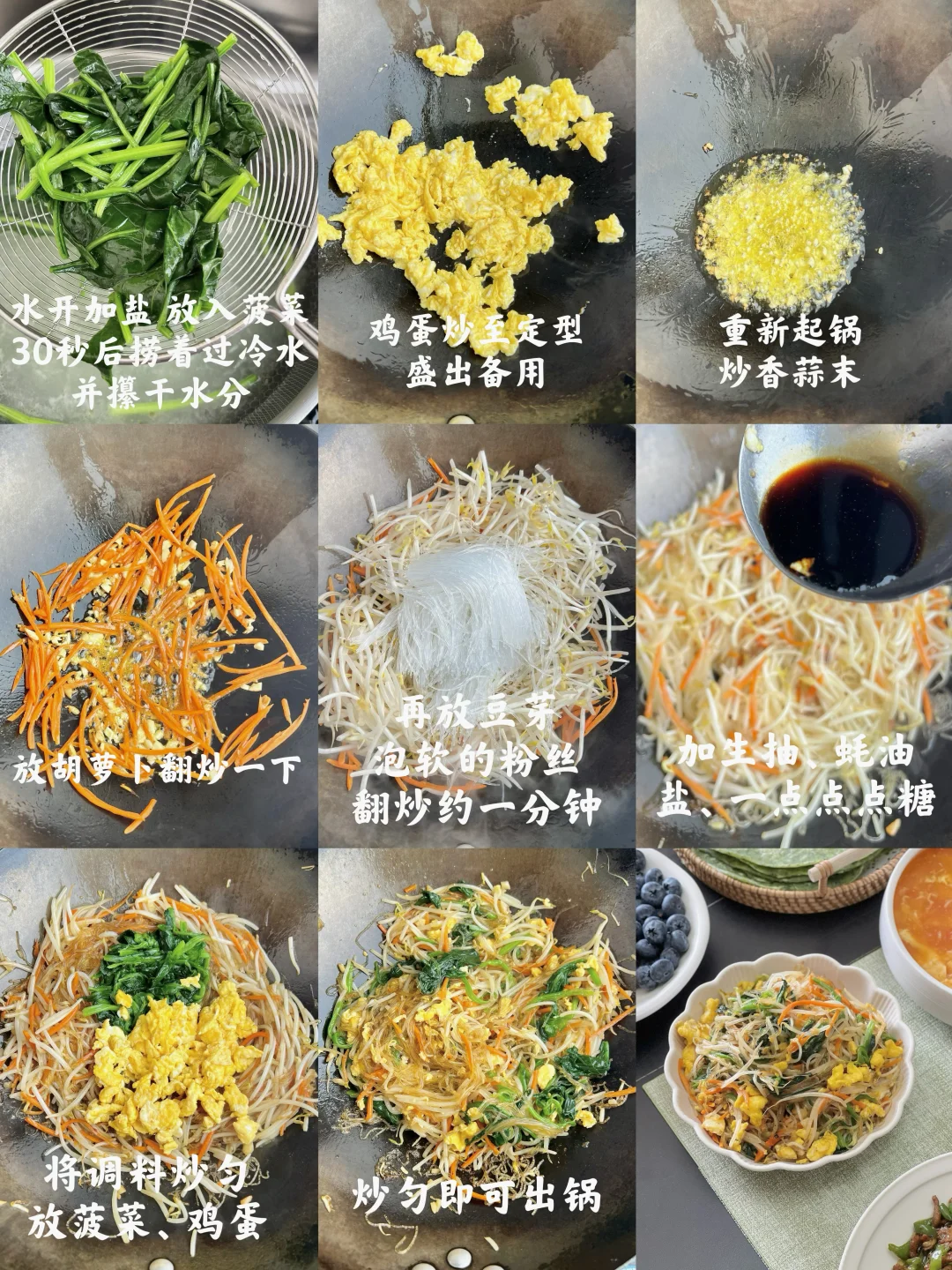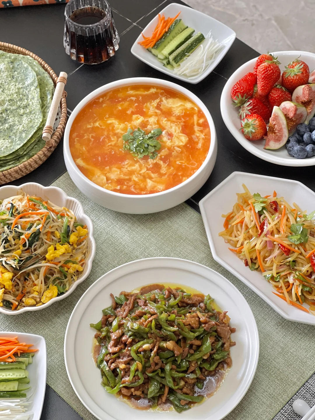 今天是不偷懒的小袁同学,自己动手做饼子[大笑R]个人卷饼小心得,菜不能少了肉丝类、鸡蛋类、粉条粉丝类,还有土豆丝,组合起来你就吃吧,三张打底[偷笑R] 【青椒肉丝】 【芽菜炒粉丝】(菠菜、豆芽) 【凉拌土豆丝】 【西红柿鸡蛋汤】 【菠菜卷饼】