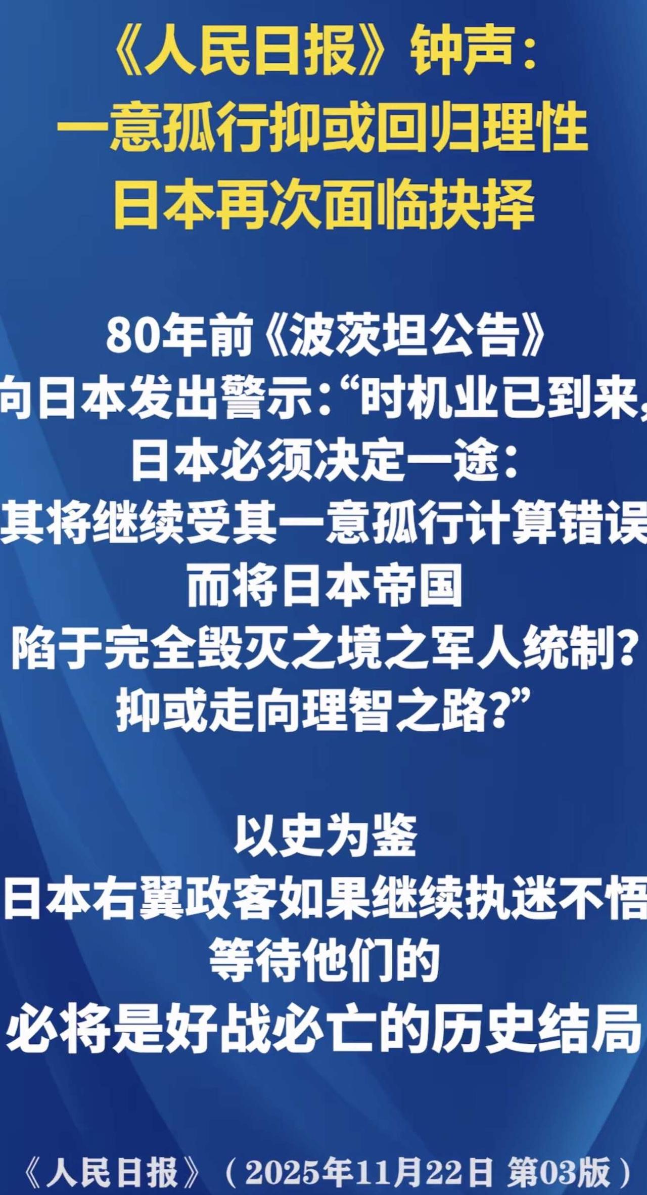高市早苗公然放狠话?人民日报:好战必亡! 有没有人跟我一样,半夜刷到这些内容睡不着的? 日本军国主义,就是狂暴的战争机器! 高市早苗在抗战胜利80周年,公然对中国放狠话? 80年前《波茨坦公告》就说了:一意孤行,只会走向毁灭! 中国从不惹事,但绝不怕事! 任何挑衅和平的行为,都必将付出代!