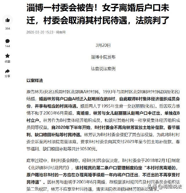 山东淄博,林芳本是A村人,嫁到B村后户口也迁了过去。离婚了,可户口没迁回原籍,还留在B村。谁料,B村村委会依据村规民约,停发了她的村民待遇。林芳不干了,起诉索要30500元待遇款,一审二审她都赢了。 林芳,是周村区北郊镇A村人。 这事得从1993年说起,这一年,她嫁到了同镇的B村,户口,也跟着迁了过去。 成了B村集体经济组织一员后,待遇,一直和其他村民没什么两样,土地补偿款,有她一份,春节福利,她也能领,缺口粮田补贴,同样没落下。 直到2003年6月,她和丈夫离了婚,户口,却没迁走,还带着女儿,在B村单独立了户。 本以为,生活还能像以前一样。 可2020年下半年,一切都变了,B村村委会,突然不再给她发那些村民待遇了。 土地补偿款没了,春节福利没了,缺口粮田补贴也没了。 林芳懵了,她找到村委会,问是怎么回事。 村委会拿出2018年2月1日制定的村规民约说:离婚后,原户籍地不是本村的,得在离婚1年内把户口迁走,不然,就不享受待遇。 林芳觉得,自己的权益,被侵犯了,自己户口还在B村,凭什么不能享受村民的待遇呢? 她没跟村委会多废话,直接把他们告到了法庭,要求支付2021年至今的各项待遇,共计30500元。 村委会说依据村规民约,林芳不享受待遇。 林芳则坚称自己户口在B村,就该享受同等待遇。 村规民约,能随意剥夺村民待遇吗? 根据《村民委员会组织法》第27条第二款,村规民约不得与法律、法规相抵触,不得侵犯村民合法财产权利。 本案中,B村2018年的村规民约,以离婚未迁户为由停发待遇,违反法律规定,该条款自始无效。 《农村集体经济组织法》第18条第一款明确规定,成员不因离婚丧失身份。 林芳户口一直在B村,未取得其他集体成员身份,仍属于B村集体经济组织成员,依法享有同等待遇。 村委会依据无效村规民约停发待遇,侵犯了林芳的财产权,需承担补发待遇的民事责任。 如果拒不履行判决,可被强制执行,相关负责人还可能被责令改正。 村规民约是村民自治,多数人同意也不一定有效,哪怕经民主程序通过,只要与法律抵触,就无效。 离婚后未迁户的村民,其成员身份不受婚姻状态影响,这不是占集体便宜,而是依法享有的权利。 一审法院认为,离婚,不是丧失集体经济组织成员身份的理由,林芳户口还在B村,就该享受同等待遇。村委会,得支付那30500元。 村委会不服,提起了上诉。 二审,法院还是维持了原判。法院觉得,一审判决合理,林芳的权益,就该得到保障。 这事,背后其实有不少隐情。 林芳离婚后,在B村生活得并不容易,她带着女儿,独自生活,本来就挺艰难。 那些村民待遇,对她来说,能帮不少忙。 可村委会为什么要停发她的待遇?是不是觉得她离婚了,就不是B村的人了? 可户口,明明还在B村。这村规民约,是不是有点不合理?离婚1年内就得迁走户口,这规定是不是太苛刻了? 林也是个倔强的人,她没选择忍气吞声,而是选择了用法律维护自己的权益,她知道自己有理,就该争取。 村委会可能也没想到,林芳会这么坚决,他们可能觉得林芳一个离婚女人,能翻起什么大浪? 可他们错了,林芳可不是好惹的。这事,在B村也引起了不小的轰动。 村民们议论纷纷,有的说村委会做得对,离婚了就该迁走户口。有的说,村委会做得不对,林芳户口还在B村,就该享受待遇。 这争议,一直持续着。直到法院判决下来,才稍微平息了点,可心里还是有不少人,觉得这事没那么简单。 林芳拿到了那30500元,可她知道这钱来得不容易,她也希望以后不要再有这样的事发生。 村委会也该反思反思了,这村规民约是不是该改改了?是不是该更合理点?是不是该更人性化点? 您对这件事有什么看法呢?
