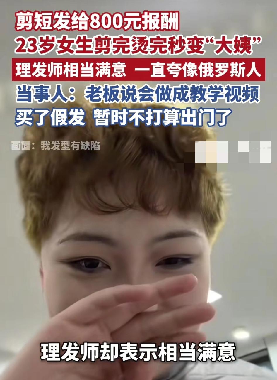 上海一女士看到网上有招聘剪头发的兼职,报酬是800元,看看到图片觉得还可以,于是就去应聘了,来到理发店,理发师先后两次把自己的头发剪短。再烫染,一共花了8小时。最后自己的发型真的像一位大妈,后面还要穿指定的服装,让理发店的工作人员拍照做成教学视频。女子说看到自己的头发真的是又想笑又低落。因为看上去整个人的年龄一下子翻倍,不过事前签了协议,店家就是怕应聘者不满意,事后闹事。女子说自己已经买了假发,短时间会尽量少出门。