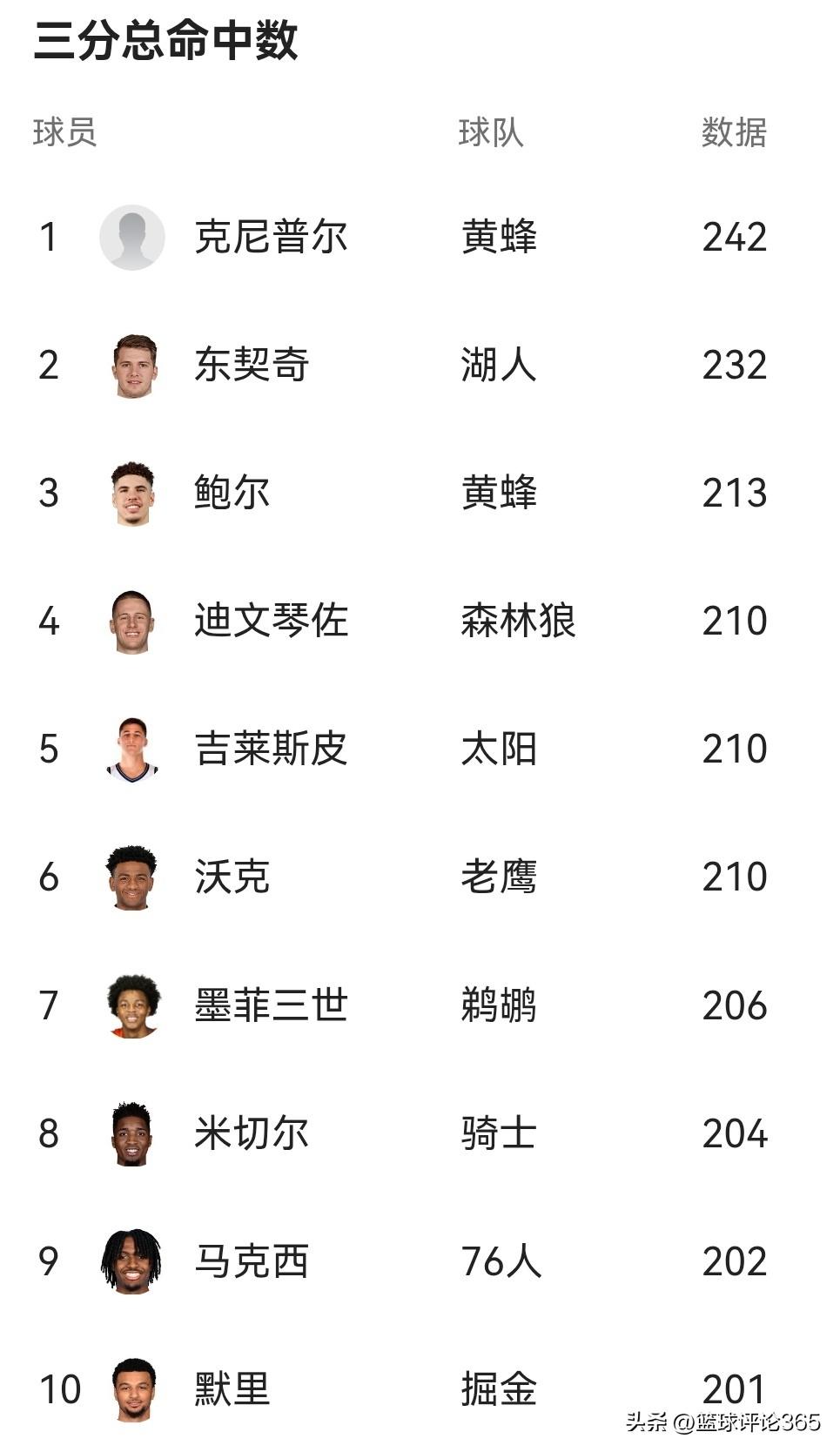 赛季三分球排名榜:榜首不是东契奇,哈登第16,库里和汤普森20名开外。 第3名:鲍尔,213记,黄蜂 第2名:东契奇,232记,湖人 第1名:克尼普尔,243记,黄蜂 值得一提的是,哈登命中185记,排名第16;汤普森命中176记,排名第21;库里命中175记,排名第22。 克尼普尔,是2025年首轮第4号秀,赛季至今场均19.3+5.3+3.4,是赛季至今的三分王,此子未来可期!