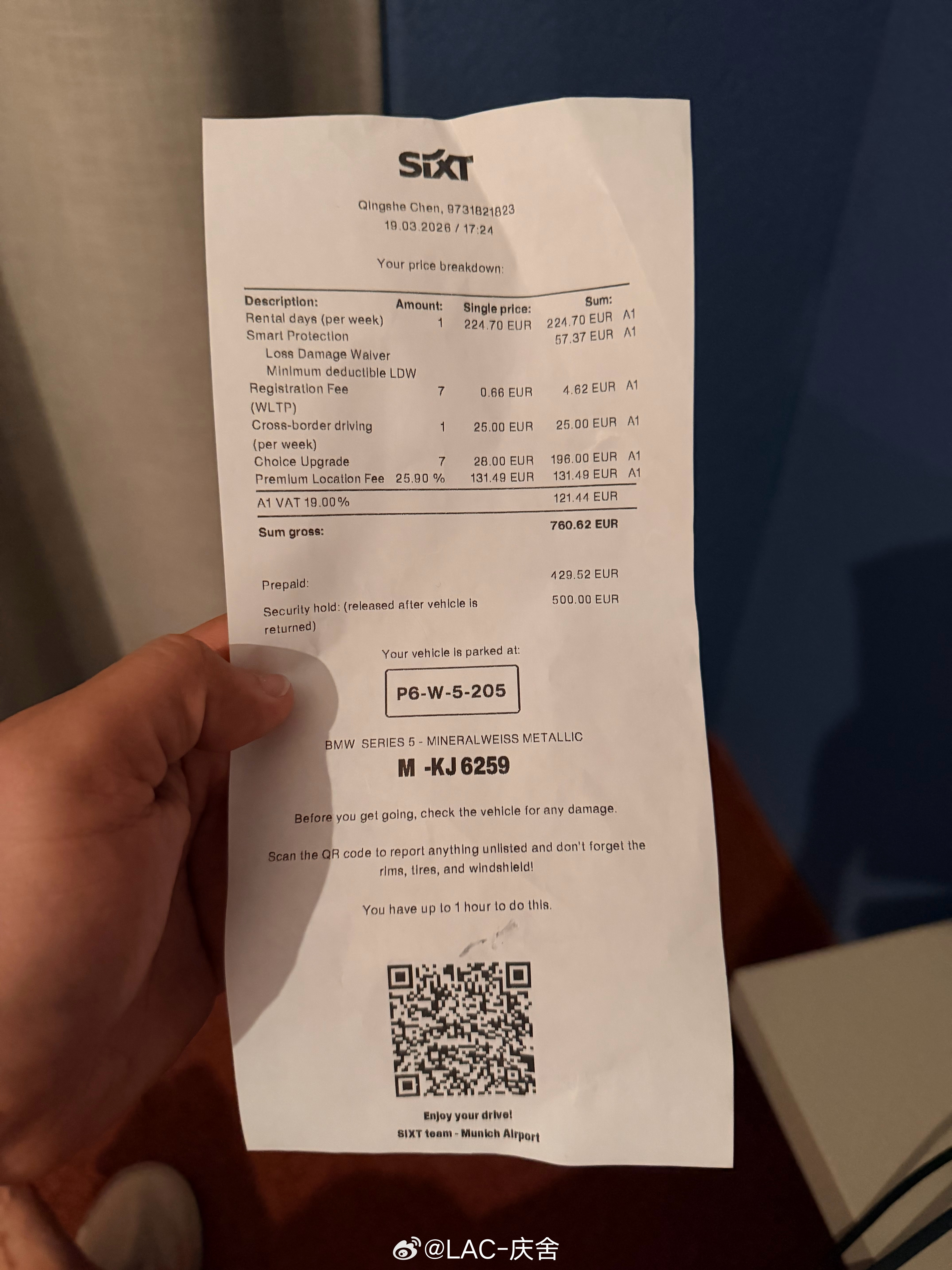 德国、瑞士、意大利租车自驾游,需要中国驾照原件及相应的英文翻译,就可以在租车行租到车了。像我这台宝马 540 Touring,7 天下来是760欧(折合每天大概865元), 这个价格对应的是每天 300 公里限制,你也可以付费解锁不限公里数。这里面叠加了我visa 高端卡给的 15% 折扣,绑定时就成了金卡会员。