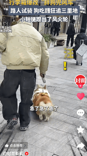 “笑不活了”浙江杭州,一男子把电动行李箱爆改成遛狗神器,女子出于好奇试骑,柯基吃