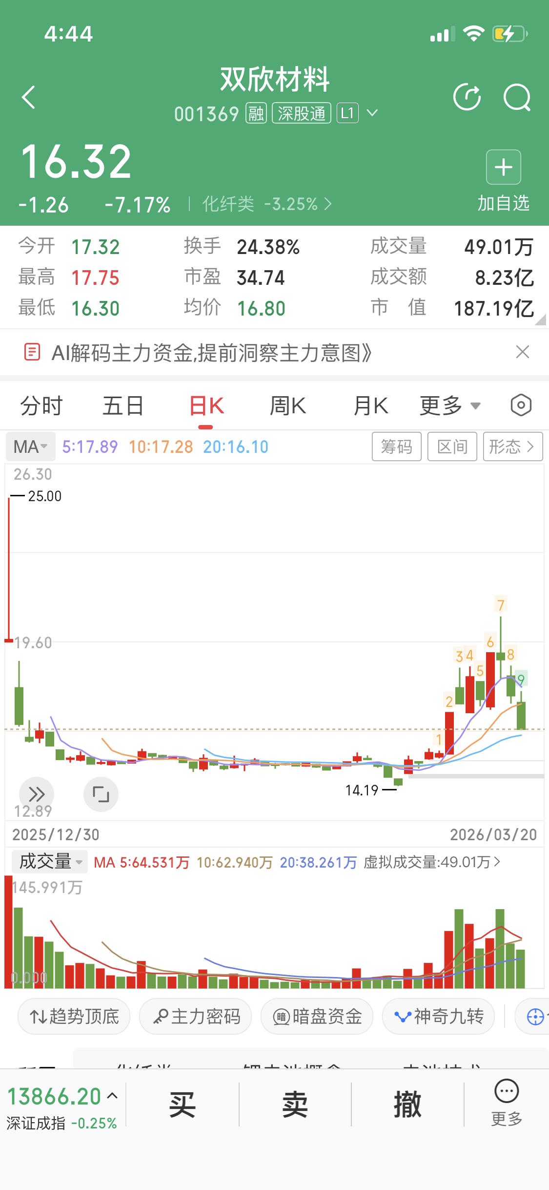 如何运用“两个放量”思维抓住涨停板,一个涨停板最少10厘米大肉 所谓“两个放量”即股价低位放量吃货,股价高位放量出货 今天拿双欣材料和锡华科技举例,这两个截图的共同点是什么?都有一段横盘震荡整理行情,都有过涨停,主升行情 以上都对,但不全对,或者说只发现表象,没有抓住实质 两个票在横盘震荡阶段,两个股票下面成交量有几个凸点,这些凸点当天的成交量比平时高,大概是平时的1.5倍到2倍之间,说明主力入场了,即低位放量主力入场 第二次放量在股价高位,获利盘出逃,放出巨量是低位放量的2倍以上,然后收长上影线,说明近期见顶,考虑撤退了 如果你仔细研究,抓住这个形态,灵活运用两个放量,你也能抓住涨停板[看]