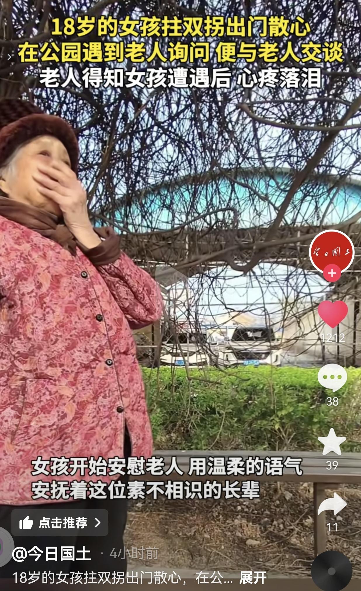 破防了!18岁拄拐姑娘公园躲清净,被问得想跑,陌生奶奶一看直接哭了! 真的看哭了,越想越心疼。 18岁,正是爱跑爱闹的年纪,这姑娘却只能拄着拐,去公园就想安安静静待一会儿,晒晒太阳,放松一下。 结果一路上,总有人追着问:“你腿咋了?怎么弄的啊?年纪轻轻怎么这样了?” 问一次两次还行,问多了谁受得了?姑娘一遍一遍解释,早就烦透了,只想躲开那些目光,安安稳稳坐一会儿。 后来一个奶奶走过来,又开始问:“你这腿不舒服啊?多大了?” 姑娘强忍着不耐烦,随口回了句:“从小就这样,18了。” 她那时候心里都盘算好了,赶紧说完赶紧溜,真不想再应付了。 结果下一秒,她抬头一看,直接愣住。 这位奶奶看着她,眼圈一下就红了,捂着嘴,眼泪哗哗往下掉,心疼得话都说不出来。 刚才还想跑的姑娘,瞬间就软了。反过来轻轻安慰奶奶:“没事奶奶,我都习惯了,不疼。” 就这么一个陌生人,一句话没说,眼泪先掉下来了。这一幕,真的戳心窝子。 网友看到后评论说:“看哭了,老人家就是见不得孩子遭罪,这眼泪太真实了。” 也有的网友说:“换我我也想跑!一直被人盯着问痛处,真的很窒息。” 也有的网友说:“明明自己最不容易,还在安慰别人,这姑娘心太软了。” 还有的网友说:“好心归好心,但别逮着人就问,尊重比同情更重要。”  我看完真的又难受又生气。生气的是,有些人总打着关心的旗号,一遍一遍揭别人的伤疤。 你随口一问是舒服了,考虑过当事人心里多煎熬吗?人家不想说,就别追着刨根问底,那不是善良,是没分寸。 可再看奶奶和姑娘那一幕,又忍不住掉眼泪。姑娘明明已经够难了,被问得烦躁想躲,可看到别人为她哭,还是第一时间去安慰。 奶奶跟她非亲非故,就是单纯看不得孩子受苦。 这世上最让人破防的,从来不是惊天动地的大事,而是陌生人不加掩饰的心疼,和一个懂事孩子藏起来的委屈。 我们总说要关爱弱势群体,可真正的关爱,不是盯着人家的不幸问来问去,而是给人一点空间,一点体面,别让人连安安静静待一会儿都难。 最后,我想说的是:别让你的“热心”,变成别人的负担。 对此,你怎么看?
