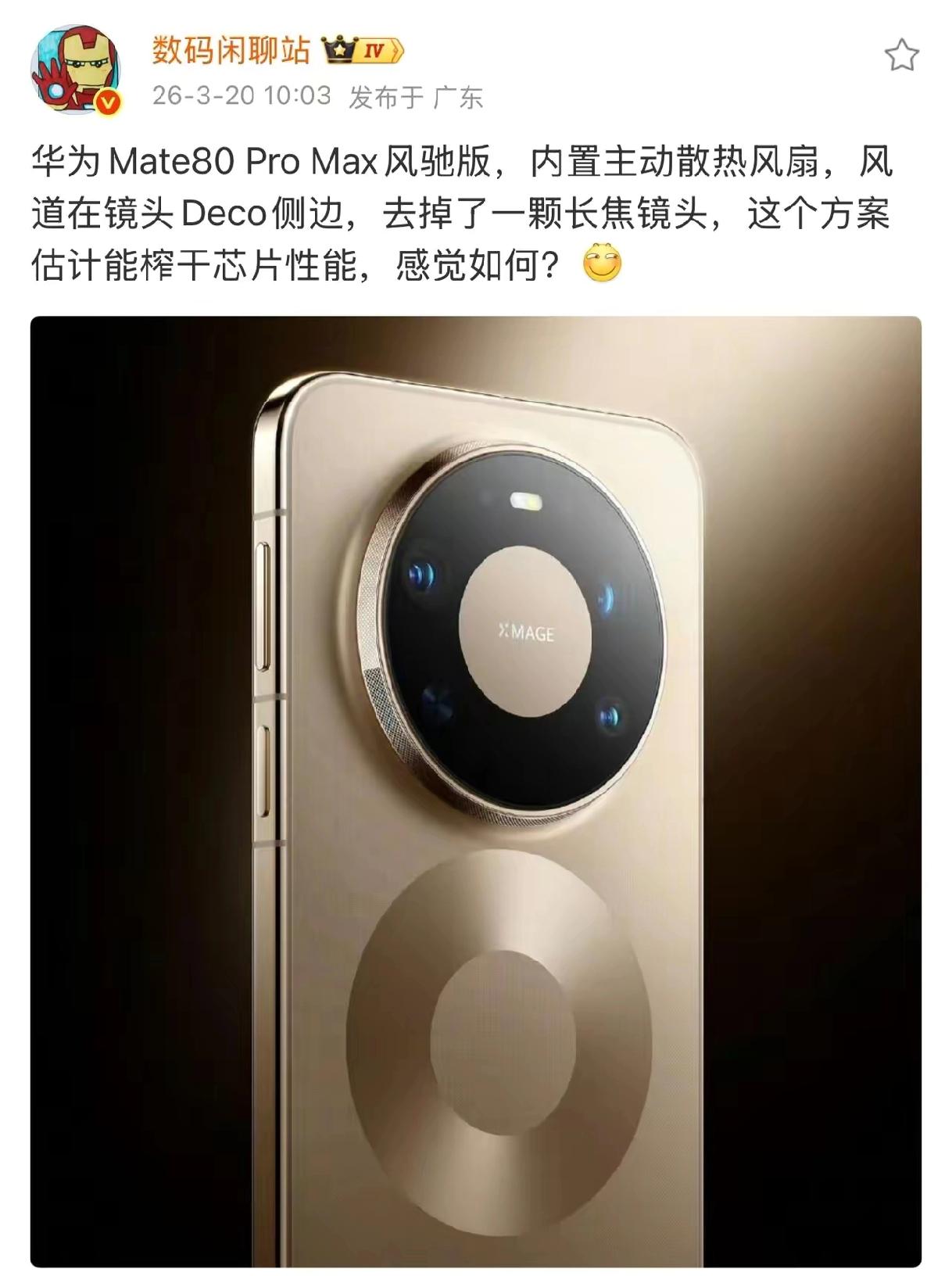 个人觉得哈,这个华为Mate80 Pro Max风驰版最适合的是直播党,而不是游戏党! 首先,华为被制裁到现在六七年了,期间发布的手机几乎没有主打游戏的,在游戏适配和调校上可能比不上友商,而且麒麟处理器性能跟主流安卓、苹果旗舰有很大的代差(也不排除这个风驰版会有奇迹出现的可能),打游戏肯定是首选加了风扇的安卓,比如红魔、荣耀WIN、IQOO 15 Ultra…… 其次,华为Mate80系列的影像能力有多牛就不用过多浪费口舌了,被选为春晚竖屏直播机器就足以说明一切,现在再加个风扇对于长时间视频录制、户外直播这种发热巨大的场景来说如虎添翼。 所以综上华为Mate80 Pro Max风驰版最适合的是直播党或者视频党,而不是游戏党[吃瓜群众]