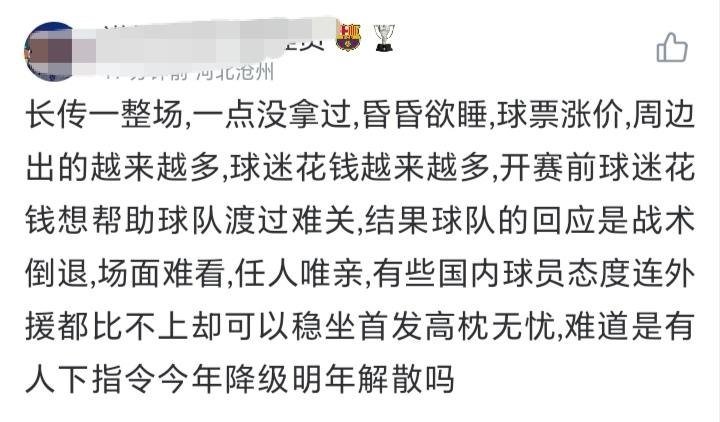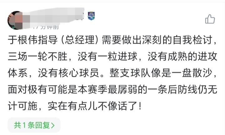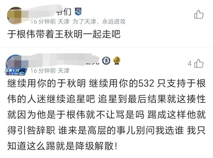 天津球迷哭了,从去年无条件支持于根伟,到现在要求他检讨,甚至下课,这也仅仅短短三周,新赛季三场比赛的时间,有的说他任人唯亲,重用王秋明和马屁型前锋谢帝内,球票涨价,球员昏昏欲睡,一盘散沙。有天津球迷总结,是媒体和球迷无条件支持于根伟而害了球队。 作为外地球迷来看,津门虎目前的困难是赛季前就可以预见的,核心离队,又被扣10分教练和球员都有压力,于根伟是神也不可能取得梦幻开局。赛季还很长,保级还得靠他,球迷这时候添乱只会增加球队的困难,合理的建议可以提,过分的话还是要少说。