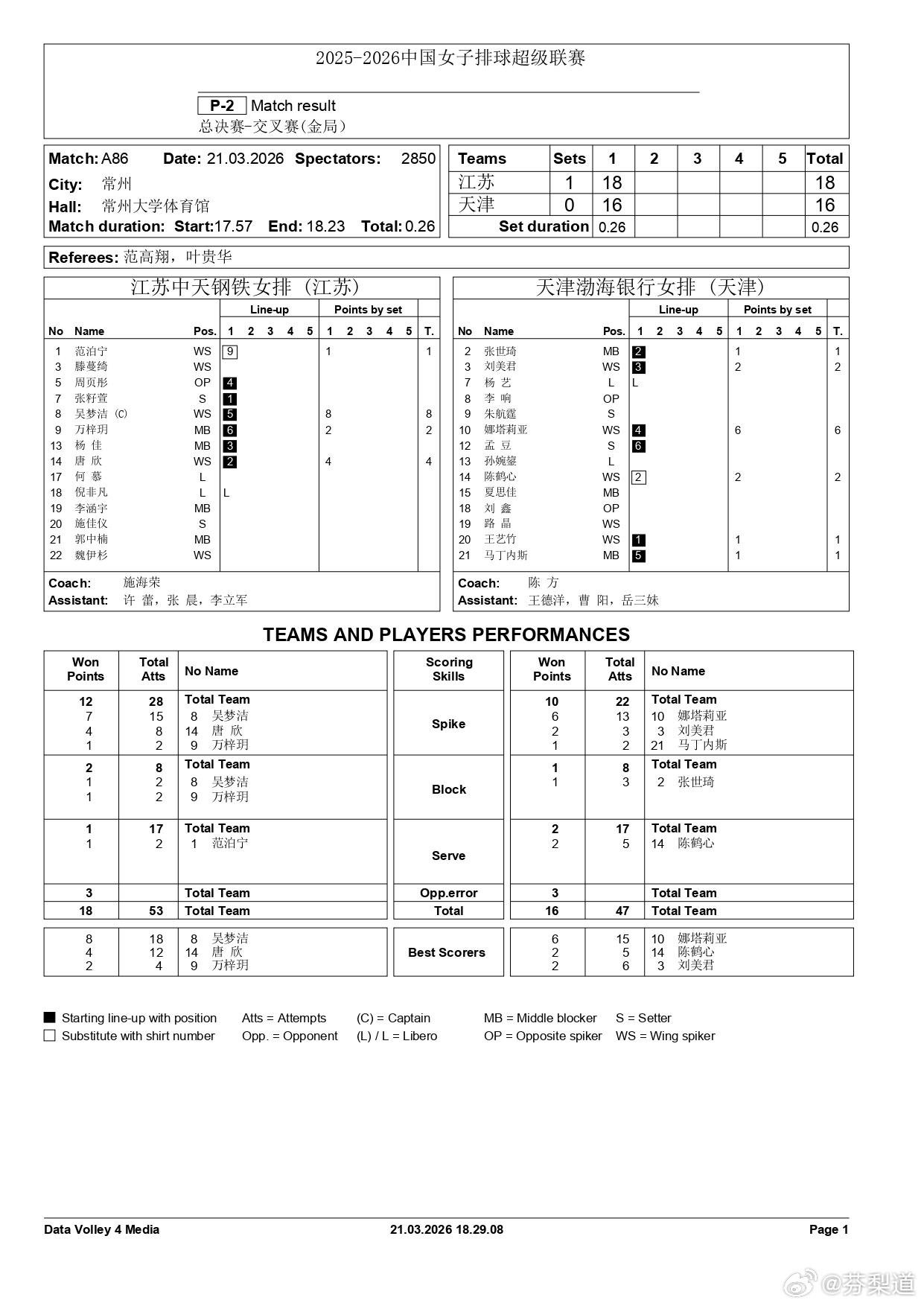 吴梦洁江苏中天钢铁女排A级半决赛次回合:江苏中天钢铁主场3-0(25-10/25-22/25-13)天津渤海银行;金局:江苏女排18-16天津女排;江苏女排将与上海女排争冠吴梦洁30分 48扣22中2失误3被拦 6拦2发