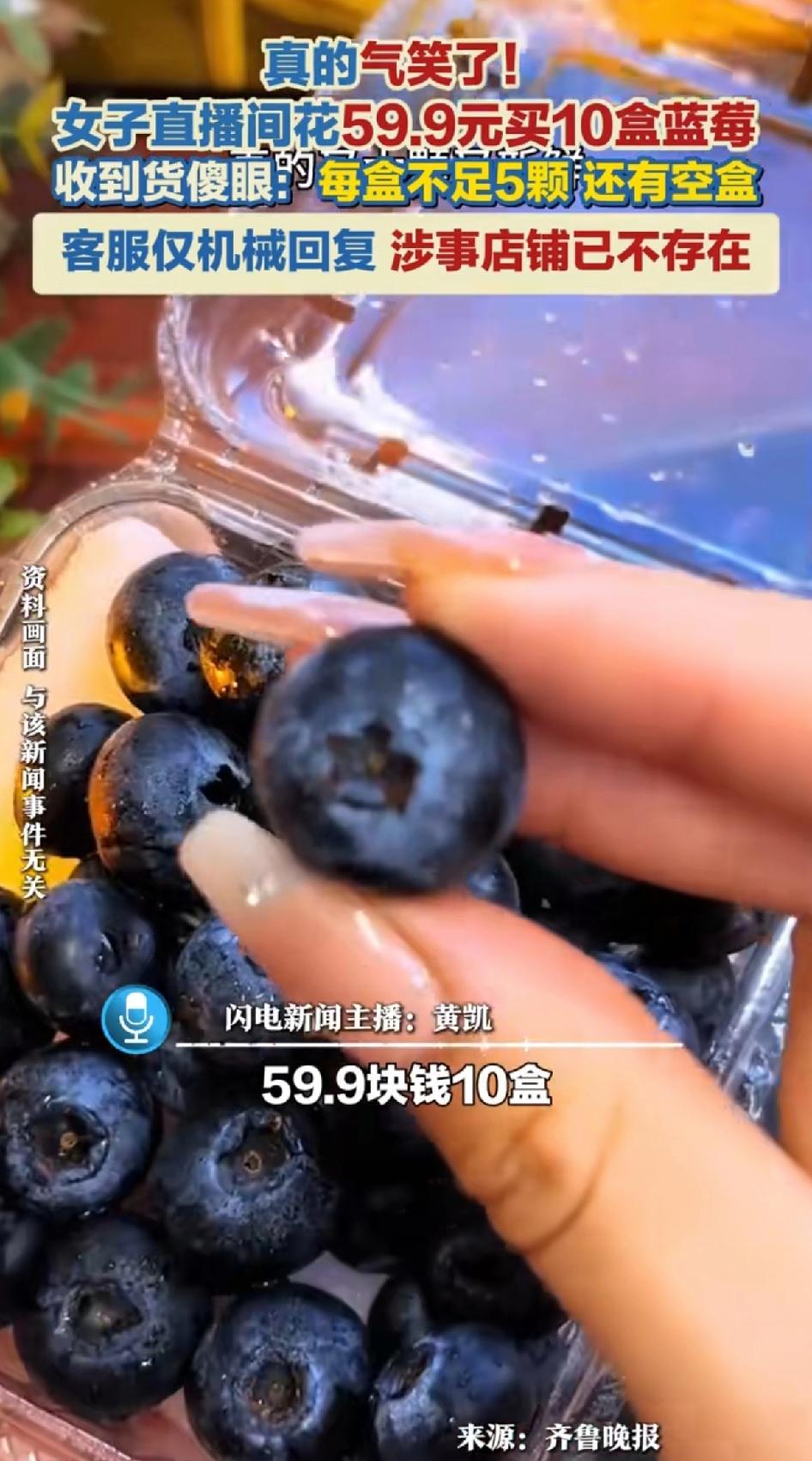 真的气笑了!女子直播间花59.9元买10盒蓝莓,收到货傻眼:每盒不足5颗,还有空盒。客服仅机械回复,涉事店铺已不存在。 这商家也太坑了吧!山东于女士在直播间花59.9元买10盒蓝莓, 主播承诺到手有2斤,本以为捡到便宜,结果收货傻眼。每盒不足5颗,还有空盒。直播间展示的蓝莓品相不错,主播和运营配合得像模像样,可实际发货地址还和宣传的“云南蓝莓”不符。 59.9两斤这样的价格如果是云南基地发货,也可以呀,又不是5.9元两斤,这样的商家真是明目张胆欺骗顾客。 于女士找客服维权,客服机械回复退款,还突然冒出一句“好的泰安朋友”,让人摸不着头脑。好在平台给她退了款,还把商家纳入重点监督范围,当晚商家就暂停营业了。估计是被众多消费者举报了,这种不良商家就该严惩!